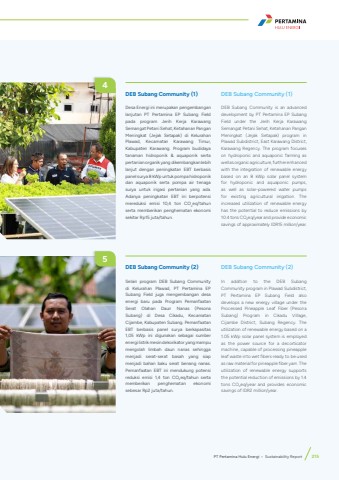 DEB Subang Community (1)Desa Energi ini merupakan pengembangan lanjutan PT Pertamina EP Subang Field pada program Jerih Kerja Karawang Semangat Petani Sehat, Ketahanan Pangan Meningkat (Jejak Setapak) di Kelurahan Plawad, Kecamatan Karawang Timur, Kabupaten Karawang. Program budidaya tanaman hidroponik & aquaponik serta pertanian organik yang dikembangkan lebih lanjut dengan peningkatan EBT berbasis panel surya 8 kWp untuk pompa hidroponik dan aquaponik serta pompa air tenaga surya untuk irigasi pertanian yang ada. Adanya peningkatan EBT ini berpotensi mereduksi emisi 10,4 ton CO2eq/tahun serta memberikan penghematan ekonomi sekitar Rp15 juta/tahun.DEB Subang Community (1)DEB Subang Community is an advanced development by PT Pertamina EP Subang Field under the Jerih Kerja Karawang Semangat Petani Sehat, Ketahanan Pangan Meningkat (Jejak Setapak) program in Plawad Subdistrict, East Karawang District, Karawang Regency. The program focuses on hydroponic and aquaponic farming as well as organic agriculture, further enhanced with the integration of renewable energy based on an 8 kWp solar panel system for hydroponic and aquaponic pumps, as well as solar-powered water pumps for existing agricultural irrigation. The increased utilization of renewable energy has the potential to reduce emissions by 10.4 tons CO2eq/year and provide economic savings of approximately IDR15 million/year.4DEB Subang Community (2)Selain program DEB Subang Community di Kelurahan Plawad, PT Pertamina EP Subang Field juga mengembangan desa energi baru pada Program Pemanfaatan Serat Olahan Daun Nanas (Pesona Subang) di Desa Cikadu, Kecamatan Cijambe, Kabupaten Subang. Pemanfaatan EBT berbasis panel surya berkapasitas 1,05 kWp ini digunakan sebagai sumber energi listrik mesin dekorikator yang mampu mengolah limbah daun nanas sehingga menjadi serat-serat basah yang siap menjadi bahan baku serat benang nanas. Pemanfaatan EBT ini mendukung potensi reduksi emisi 1,4 ton CO2eq/tahun serta memberikan penghematan ekonomi sebesar Rp2 juta/tahun.DEB Subang Community (2)In addition to the DEB Subang Community program in Plawad Subdistrict, PT Pertamina EP Subang Field also develops a new energy village under the Processed Pineapple Leaf Fiber (Pesona Subang) Program in Cikadu Village, Cijambe District, Subang Regency. The utilization of renewable energy based on a 1.05 kWp solar panel system is employed as the power source for a decorticator machine, capable of processing pineapple leaf waste into wet fibers ready to be used as raw material for pineapple fiber yarn. The utilization of renewable energy supports the potential reduction of emissions by 1.4 tons CO2eq/year and provides economic savings of IDR2 million/year.5PT Pertamina Hulu Energi %u2022 Sustainability Report 215