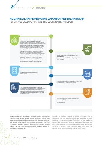 23 4 5 6 7 8 9 10 11 Tentang Laporan IniAbout This ReportUntuk memberikan kemudahan pembaca dalam menemukan informasi yang sesuai dengan kedua pedoman, nomor atau angka pengungkapan pedoman dicantumkan di belakang kalimat atau alinea yang sesuai. Data lengkap kecocokan informasi Perusahaan dengan SEOJK No.16/SEOJK.04/2021, Indeks Standar GRI, dan SDGs disajikan di bagian belakang laporan ini, dimulai pada halaman 240. In order to facilitate readers in finding information that is consistent with the abovementioned two guidelines, we have indicated the number or figure of disclosure in both guidelines at the end of the relevant sentence or paragraph. Complete data on the compatibility of the Company%u2019s information with SEOJK No.16/SEOJK.04/2021, GRI Standards Index, and SGDs are included at the end of this report, starting on page 240. ACUAN DALAM PEMBUATAN LAPORAN KEBERLANJUTANREFERENCE USED TO PREPARE THE SUSTAINABILITY REPORTPeraturan Otoritas Jasa Keuangan Nomor 51/POJK.03/2017 tentang Penerapan Keuangan Berkelanjutan bagi Lembaga Jasa Keuangan, Emiten, dan Perusahaan Publik dan Pedoman Teknis Penyusunan Laporan Keberlanjutan bagi Emitan dan Perusahaan Publik yang dituangkan dalam Surat Edaran Otoritas Jasa Keuangan (SEOJK) No.16 /SEOJK.04/2021 tentang Bentuk Dan Isi Laporan Tahunan Emiten Atau Perusahaan Publik.Financial Services Authority Regulation Number 51/POJK.03/2017 concerning the Implementation of Sustainable Finance for Financial Services Institutions, Issuers and Public Companies and Technical Guidelines for Preparing Sustainability Reports for Issuers and Public Companies as outlined in the Financial Services Authority Circular Letter (SEOJK) No. 16 /SEOJK.04/2021 concerning the Form and Content of Annual Reports of Issuers or Public Companies.15The Oil and Gas Industry Guidance on Voluntary Sustainability Reporting 4th edition 2020-International Petroleum Industry Environmental Conservation Association (IPIECA), American Petroleum Institute (API), and the International Association of Oil & Gas Producers (IOGP) 6Panduan Task Force on Climate-related Financial Disclosures (TCFD)The Task Force on Climate-related Financial Disclosures (TCFD) guidelines3Oil and Gas Sector Specific Disclosure (OGSS) (2021)2Standar Global Reporting Initiative (GRI) 2021: %u2018In Accordance to%u2019In accordance to the 2021 Global Reporting Initiative (GRI) Standards4Sustainability Accounting Standard Board (SASB) Oil & Gas (Exploration & Production) Standard20 Laporan Keberlanjutan %u2022 PT Pertamina Hulu Energi