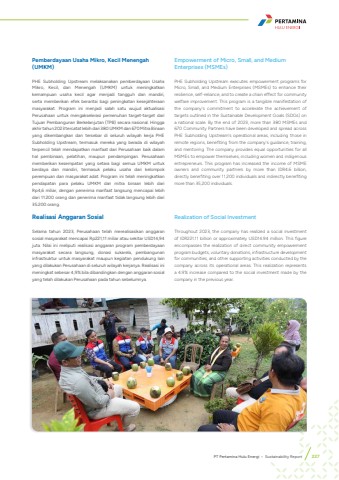 Pemberdayaan Usaha Mikro, Kecil Menengah (UMKM)PHE Subholding Upstream melaksanakan pemberdayaan Usaha Mikro, Kecil, dan Menengah (UMKM) untuk meningkatkan kemampuan usaha kecil agar menjadi tangguh dan mandiri, serta memberikan efek berantai bagi peningkatan kesejahteraan masyarakat. Program ini menjadi salah satu wujud aktualisasi Perusahaan untuk mengakselerasi pemenuhan target-target dari Tujuan Pembangunan Berkelanjutan (TPB) secara nasional. Hingga akhir tahun 2023 tercatat lebih dari 380 UMKM dan 670 Mitra Binaan yang dikembangkan dan tersebar di seluruh wilayah kerja PHE Subholding Upstream, termasuk mereka yang berada di wilayah terpencil telah mendapatkan manfaat dari Perusahaan baik dalam hal pembinaan, pelatihan, maupun pendampingan. Perusahaan memberikan kesempatan yang setara bagi semua UMKM untuk berdaya dan mandiri, termasuk pelaku usaha dari kelompok perempuan dan masyarakat adat. Program ini telah meningkatkan pendapatan para pelaku UMKM dan mitra binaan lebih dari Rp4,6 miliar, dengan penerima manfaat langsung mencapai lebih dari 11.200 orang dan penerima manfaat tidak langsung lebih dari 35.200 orang. Realisasi Anggaran SosialSelama tahun 2023, Perusahaan telah merealisasikan anggaran sosial masyarakat mencapai Rp221,11 miliar atau sekitar USD14,94 juta. Nilai ini meliputi realisasi anggaran program pemberdayaan masyarakat secara langsung, donasi sukarela, pembangunan infrastruktur untuk masyarakat maupun kegiatan pendukung lain yang dilakukan Perusahaan di seluruh wilayah kerjanya. Realisasi ini meningkat sebesar 4,9% bila dibandingkan dengan anggaran sosial yang telah dilakukan Perusahaan pada tahun sebelumnya. Empowerment of Micro, Small, and Medium Enterprises (MSMEs)PHE Subholding Upstream executes empowerment programs for Micro, Small, and Medium Enterprises (MSMEs) to enhance their resilience, self-reliance, and to create a chain effect for community welfare improvement. This program is a tangible manifestation of the company's commitment to accelerate the achievement of targets outlined in the Sustainable Development Goals (SDGs) on a national scale. By the end of 2023, more than 380 MSMEs and 670 Community Partners have been developed and spread across PHE Subholding Upstream's operational areas, including those in remote regions, benefiting from the company's guidance, training, and mentoring. The company provides equal opportunities for all MSMEs to empower themselves, including women and indigenous entrepreneurs. This program has increased the income of MSME owners and community partners by more than IDR4.6 billion, directly benefiting over 11,200 individuals and indirectly benefiting more than 35,200 individuals.Realization of Social InvestmentThroughout 2023, the company has realized a social investment of IDR221.11 billion or approximately USD14.94 million. This figure encompasses the realization of direct community empowerment program budgets, voluntary donations, infrastructure development for communities, and other supporting activities conducted by the company across its operational areas. This realization represents a 4.9% increase compared to the social investment made by the company in the previous year.PT Pertamina Hulu Energi %u2022 Sustainability Report 227