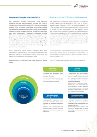 Penerapan Kerangka Pelaporan TCFD Application of the TCFD Reporting Framework PHE Subholding Upstream berkomitmen untuk mengatasi perubahan iklim dan telah mengadopsi kerangka Task Force on Climate-related Financial Disclosures (TCFD). Dengan mengadopsi kerangka TCFD, Perusahaan menunjukkan komitmennya terhadap transparansi dan akuntabilitas. Hal ini juga membantu meningkatkan kesadaran terhadap perubahan iklim dan membangun masa depan yang lebih berkelanjutan. Perusahaan mengadopsi kerangka TCFD untuk meningkatkan transparansi dan akuntabilitas dalam pelaporan risiko dan peluang terkait perubahan iklim. Kerangka kerja ini juga membantu Perusahaan untuk mengidentifikasi dan mengelola risiko terkait perubahan iklim serta mengidentifikasi dan memanfaatkan peluang terkait perubahan iklim. Hal ini dapat membantu Perusahaan untuk tumbuh dan berkembang dalam perekonomian rendah karbon.TCFD menekankan bahwa dampak perubahan iklim dapat menimbulkan risiko keuangan yang signifikan terhadap bisnis. Sehingga, risiko-risiko tersebut harus dinilai, diungkapkan, dan dikelola secara efektif oleh seluruh pelaku usaha.Kerangka kerja TCFD dibangun di atas empat elemen inti sebagai berikut:PHE Subholding Upstream has been committed to addressing climate change and it has adopted the Task Force on Climaterelated Financial Disclosures (TCFD) framework. By adopting the TCFD framework, the Company has demonstrated its commitment to transparency and accountability. This also supports raising awareness of climate change and building a more sustainable future. The Company has adopted the TCFD framework in order to improve transparency and accountability in risk reporting and opportunities related to climate change. This operational framework also helps the Company identify and manage risks related to climate change as well as identify and use opportunities related to climate change. This can potentially help the Company grow and develop in the low carbon economy.TCFD highlights the potential for significant financial risks to arise from climate change impacts on businesses. Consequently, it is imperative for all business entities to effectively assess, disclose, and manage these risks.The TCFD framework is structured around four core elements:GovernanceStrategyRisk ManagementMetricks and TargetsRisk Management (Manajemen Risiko):Governance (Tata Kelola):Metrics and Targets (Metrik dan Target):Strategy (Strategi):Memastikan risiko dan peluang terkait iklim diintegrasikan ke dalam struktur tata kelola perusahaan.Ensuring that climate-related risks and opportunities are integrated into the corporate governance structure.Mengungkapkan bagaimana risiko terkait iklim dinilai dan dikelola dalam organisasi dan mekanisme manajemen risiko.Revealing how climate-related risks are assessed and managed within the organization and its risk management mechanisms.Mengidentifikasi dan mengungkapkan risiko dan peluang terkait iklim organisasi, termasuk analisa skenario perubahan iklim dalam pertimbangan penyusunan strategi jangka pendek, menengah, dan panjang dari Perusahaan.Identifying and disclosing climaterelated risks and opportunities for the organization, including analyzing climate change scenarios in formulating short-term, medium-term, and longterm strategies of the Company.Memberikan transparansi mengenai metrik dan target yang digunakan untuk menilai serta mengelola risiko dan peluang terkait iklim.Providing transparency regarding the metrics and targets used to assess and manage climate-related risks and opportunities.PT Pertamina Hulu Energi %u2022 Sustainability Report 21