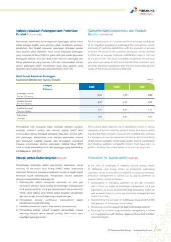 Indeks Kepuasan Pelanggan dan Penarikan Produk [OJK F.29, F.30]Perusahaan melakukan survei kepuasan pelanggan setiap tahun sekali sebagai praktik yang penting untuk memahami persepsi, kebutuhan, dan tingkat kepuasan pelanggan terhadap produk atau layanan yang diberikan. Hasil survei kepuasan pelanggan yang diperoleh di tahun 2023 ini yakni rata-rata Indeks Kepuasan Pelanggan sebesar 4,51 dari skala 5,00. Hasil ini meningkat dari tahun sebelumnya yang bernilai 4,30 dan menunjukkan secara umum pelanggan telah menyatakan puas atas layanan yang diberikan dan kualitas produk yang dikirimkan. [OJK F.30]KategoriCategory2023 2022 2021Kuantitas ProdukProduct Quantity 4,46 4,31 3,88Kualitas ProdukProduct Quality 4,47 4,30 3,98Kualitas LayananService Quality 4,57 4,29 4,01Rata-RataAverage 4,51 4,30 3,97Hasil Survei Kepuasan PelangganCustomer Satisfaction Survey Results dalam %In %Peningkatan nilai kepuasan pada berbagai kategori product quantity, product quality dan service quality relatif kecil menunjukkan bahwa terdapat perbaikan kepuasan, dimana ratarata pelanggan menyatakan puas dengan kesesuaian volume gas, kesesuaian kualitas pasokan gas, kemudahan koordinasi maupun penanganan keluhan pelanggan. Selama tahun 2023 tidak ada pula penarikan produk oleh pelanggan yang dikarenakan ketidakpuasan. [OJK F.29]Inovasi untuk Keberlanjutan [OJK F.26]Menghadapi tantangan dalam pemenuhan kebutuhan energi nasional, PT Pertamina Hulu Energi (PHE), selaku Subholding Upstream Pertamina, berupaya melakukan inovasi di segala aspek termasuk aspek keberlanjutan. Pengelolaan inovasi dilakukan dengan memperhatikan beberapa hal:1. Keberlanjutan dalam mengelola upstream oil and gas innovation dengan fokus quality & knowledge management, oil & gas exploration, oil & gas development dan production, HSSE, serta bidang yang terkait dalam kegiatan pengelolaan dan penciptaan inovasi & teknologi minyak dan gas;2. Menjalankan prinsip continuous improvement dalam pengelolaan inovasi teknologi;3. Memiliki commercial aspect, baik internal dan eksternal;4. Memastikan bahwa seluruh kegiatan pengelolaan inovasi teknologi berjalan sesuai dengan strategi, fokus bisnis, serta target pengurangan emisi.The increase, albeit relatively low, in satisfaction scores in various categories of product quantity, product quality and service quality indicate that there has been improvement in satisfaction, whereby the average customer has expressed satisfaction with the suitability of gas volume, suitability of gas supply quality, ease of coordination and handling customer complaints. In2023, there have been no product recalls by customers due to dissatisfaction. [OJK F.29]Innovation for Sustainability [OJK F.26]In the face of challenges in meeting national energy needs, PT Pertamina Hulu Energi (PHE), as Pertamina%u2019s Subholding Upstream, strives to innovate in all aspects including sustainability. Innovation management is carried out by paying attention to several matters, namely as follows:1. Sustainability in managing upstream oil and gas innovation with a focus on quality & knowledge management, oil & gas exploration, oil & gas development and production, HSSE, as well as related fields in oil and gas innovation management and creation activities; 2. Implementing the principle of continuous improvement in the management of technological innovation; 3. Possessing commercial aspects, both internal and external; 4. Ensuring that all technology innovation management activities run in accordance with strategy, business focus, and emission reduction targets.Customer Satisfaction Index and Product Recalls [OJK F.29, F.30]The Company conducts customer satisfaction surveys once a year as an important practice to understand the perceptions, needs, and levels of customer satisfaction with the products or services provided. The results of the customer satisfaction survey obtained in 2023 are an average Customer Satisfaction Index of 4.51 out of a scale of 5.00. This result increased compared to the previous year which was valued at 4.30 and it indicates that customers have generally expressed satisfaction with the service provided and the quality of the products delivered. [OJK F.30]PT Pertamina Hulu Energi %u2022 Sustainability Report 229