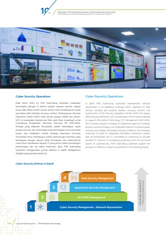 Keberadaan PHE Subholding Upstream untuk Kesejahteraan MasyarakatThe Presence of PHE Subholding Upstream for Community Welfare 11Cyber Security OperationsPada tahun 2023 ini, PHE Subholding Upstream melakukan peremajaan jaringan di seluruh wilayah cakupan operasi, migrasi pusat data (data center) secara sentral serta pembangunan pusat pemulihan data (disaster recovery center). Pembangunan Security Operation Center (SOC) telah dimulai dengan efektif dan efisien. SOC ini merupakan realisasi dari Peta Jalan Siber (roadmap) untuk mendukung Pengelolaan Teknologi Informasi (IT) 2021-2025. Strategi yang dilakukan Perusahaan adalah menerapkan aspek people, process, dan technology secara terintegrasi untuk mencapai tujuan, dan melakukan inisiatif strategis keamanan informasi Perusahaan terus membangun sistem perlindungan informasi yang terintegrasi dengan seluruh Anak Perusahaan dan berkomitmen untuk terus memberikan layanan IT yang prima. Dalam membangun perlindungan dari sisi teknis keamanan siber, PHE Subholding Upstream menggunakan prinsip defense in depth sebagaimana disajikan pada gambar berikut ini:Cyber Security OperationsIn 2023, PHE Subholding Upstream implemented network rejuvenation in all operating coverage areas, migration of data centres centrally and building disaster recovery centres. The construction of the Security Operation Center (SOC) has begun effectively and efficiently. SOC is a realization of the Cyber Roadmap to support Information Technology (IT) Management 2021-2025. The Company adopts a strategy to implement aspects of people, process, and technology in an integrated manner to achieve goals, and carry out strategic information security initiatives. The Company continues to build an integrated information protection system with all Subsidiaries and is committed to continuing to provide excellent IT services. In developing protection from the technical aspect of cybersecurity, PHE Subholding Upstream applies the principle of defense in depth as presented in the following figure:1 Cyber Security Management - Network Rejuvenation2 DC & DRC Management3 Application Security Management4 Data Security ManagementCyber Security Defense in DepthInfrastruktur Keamanan IT IT Security Infrastructure10234 Laporan Keberlanjutan %u2022 PT Pertamina Hulu Energi