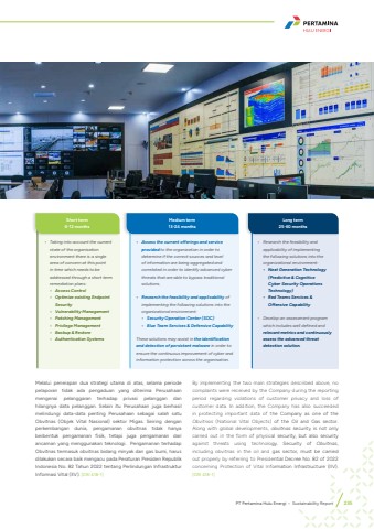 Melalui penerapan dua strategi utama di atas, selama periode pelaporan tidak ada pengaduan yang diterima Perusahaan mengenai pelanggaran terhadap privasi pelanggan dan hilangnya data pelanggan. Selain itu Perusahaan juga berhasil melindungi data-data penting Perusahaan sebagai salah satu Obvitnas (Objek Vital Nasional) sektor Migas. Seiring dengan perkembangan dunia, pengamanan obvitnas tidak hanya berbentuk pengamanan fisik, tetapi juga pengamanan dari ancaman yang menggunakan teknologi. Pengamanan terhadap Obvitnas termasuk obvitnas bidang minyak dan gas bumi, harus dilakukan secara baik mengacu pada Peraturan Presiden Republik Indonesia No. 82 Tahun 2022 tentang Perlindungan Infrastruktur Informasi Vital (IIV). [GRI 418-1]By implementing the two main strategies described above, no complaints were received by the Company during the reporting period regarding violations of customer privacy and loss of customer data. In addition, the Company has also succeeded in protecting important data of the Company as one of the Obvitnas (National Vital Objects) of the Oil and Gas sector. Along with global developments, obvitnas security is not only carried out in the form of physical security, but also security against threats using technology. Security of Obvitnas, including obvitnas in the oil and gas sector, must be carried out properly by referring to Presidential Decree No. 82 of 2022 concerning Protection of Vital Information Infrastructure (IIV). [GRI 418-1]%u2022 Taking into account the current state of the organisation environment there is a single area of concern at this point in time which needs to be addressed through a short term remediation plans:%u2022 Access Control%u2022 Optimize existing Endpoint Security%u2022 Vulnerability Management%u2022 Patching Management%u2022 Privilege Management%u2022 Backup & Restore%u2022 Authentication Systems%u2022 Assess the current offerings and service provided to the organization in order to determine if the correct sources and level of information are being aggregated and correlated in order to identify advanced cyber threats that are able to bypass traditional solutions.%u2022 Research the feasibility and applicability of implementing the following solutions into the organizational environment:%u2022 Security Operation Center (SOC)%u2022 Blue Team Services & Defensive CapabilityThese solutions may assist in the identification and detection of persistent malware in order to ensure the continuous improvement of cyber and information protection across the organisation.%u2022 Research the feasibility and applicability of implementing the following solutions into the organizational environment:%u2022 Next Generation Technology (Predictive & Cognitive Cyber Security Operations Technology)%u2022 Red Teams Services & Offensive Capability%u2022 Develop an assessment program which includes well defined and relevant metrics and continuously assess the advanced threat detection solution.Short term 6-12 monthsMedium term 13-24 monthsLong term 25-60 monthsPT Pertamina Hulu Energi %u2022 Sustainability Report 235