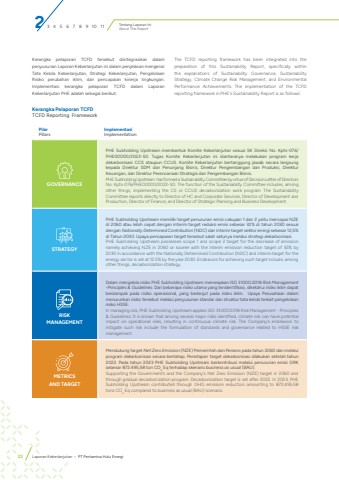 23 4 5 6 7 8 9 10 11 Tentang Laporan IniAbout This ReportKerangka pelaporan TCFD tersebut diintegrasikan dalam penyusunan Laporan Keberlanjutan ini dalam penjelasan mengenai Tata Kelola Keberlanjutan, Strategi Keberlanjutan, Pengelolaan Risiko perubahan iklim, dan pencapaian kinerja lingkungan. Implementasi kerangka pelaporan TCFD dalam Laporan Keberlanjutan PHE adalah sebagai berikut: The TCFD reporting framework has been integrated into the preparation of this Sustainability Report, specifically within the explanations of Sustainability Governance, Sustainability Strategy, Climate Change Risk Management, and Environmental Performance Achievements. The implementation of the TCFD reporting framework in PHE's Sustainability Report is as follows:PilarPillarsImplementasiImplementationGOVERNANCEPHE Subholding Upstream membentuk Komite Keberlanjutan sesuai SK Direksi No. Kpts-076/PHE00000/2022-S0. Tugas Komite Keberlanjutan ini diantaranya melakukan program kerja dekarbonisasi CCS ataupun CCUS. Komite Keberlanjutan bertanggung jawab secara langsung kepada Direktur SDM dan Penunjang Bisnis, Direktur Pengembangan dan Produksi, Direktur Keuangan, dan Direktur Perencanaan Strategis dan Pengembangan Bisnis.PHE Subholding Upstream has formed a Sustainability Committee by virtue of Decision Letter of Directors No. Kpts-076/PHE00000/2022-S0. The function of the Sustainability Committee includes, among other things, implementing the CS or CCUS decarbonization work program. The Sustainability Committee reports directly to Director of HC and Corporate Services, Director of Development and Production, Director of Finance, and Director of Strategic Planning and Business Development.STRATEGYPHE Subholding Upstream memiliki target penurunan emisi cakupan 1 dan 2 yaitu mencapai NZE di 2060 atau lebih cepat dengan interim target reduksi emisi sebesar 32% di tahun 2030 sesuai dengan Nationally Determined Contribution (NDC) dan interim target sektor energi sebesar 12,5% di Tahun 2030. Upaya pencapaian target tersebut salah satunya melalui strategi dekarbonisasi.PHE Subholding Upstream possesses scope 1 and scope 2 target for the decrease of emission namely achieving NZE in 2060 or sooner with the interim emission reduction target of 32% by 2030 in accordance with the Nationally Determined Contribution (NDC) and interim target for the energy sector is set at 12.5% by the year 2030. Endeavors for achieving such target include, among other things, decarbonization strategy.RISK MANAGEMENTDalam mengelola risiko PHE Subholding Upstream menerapkan ISO 31000:2018 Risk Management -Principles & Guidelines. Dari beberapa risiko utama yang teridentifikasi, diketahui risiko iklim dapat berdampak pada risiko operasional, yang berlanjut pada risiko iklim. Upaya Perusahaan dalam menurunkan risiko tersebut melalui penyusunan standar dan struktur tata kelola terkait pengelolaan risiko HSSE.In managing risk, PHE Subholding Upstream applies ISO 31000:2018 Risk Management - Principles & Guidelines. It is known that among several major risks identified, climate risk can have potential impact on operational risks, resulting in continuous climate risk. The Company%u2019s endeavors to mitigate such risk include the formulation of standards and governance related to HSSE risk management.METRICS AND TARGETMendukung target Net Zero Emission (NZE) Pemerintah dan Persero pada tahun 2060 dan melalui program dekarbonisasi secara bertahap. Penetapan target dekarbonisasi dilakukan setelah tahun 2022. Pada tahun 2023 PHE Subholding Upstream berkontribusi melalui penurunan emisi GRK sebesar 872.495,58 ton CO2 Eq terhadap skenario business as usual (BAU).Supporting the Government%u2019s and the Company%u2019s Net Zero Emission (NZE) target in 2060 and through gradual decarbonization program. Decarbonization target is set after 2022. In 2023, PHE Subholding Upstream contributed through GHG emission reduction amounting to 872,495.58 tons CO2 Eq compared to business as usual (BAU) scenario.Kerangka Pelaporan TCFDTCFD Reporting Framework22 Laporan Keberlanjutan %u2022 PT Pertamina Hulu Energi