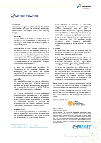 PT. Moores Rowland Indonesia Jl. Sisingamangaraja No. 26 %u2013 Jakarta Selatan 12120 - Indonesia Tel: +62 21 720 2605 - Fax: +62 21 720 2606 - www.moores-rowland.com Conclusions Conclusions in regard to adherence to the AA1000 AccountAbility Principles of Inclusivity, Materiality,Responsiveness and Impact include the following findings:%u25aa InclusivityAn assessment was made on whether PHE has included all key stakeholders in developing and achieving an accountable and strategic response to sustainability issues.Demonstration of PHE%u2019s strong commitment to stakeholder inclusivity included the conducting of needs assessment surveys and a materiality level survey of the key stakeholder groups. Our overall assessment is that PHE has set in place an effective system that enables key stakeholders to participate in the development of the organization's response in the context of sustainability.In order to maintain and strengthen the effectiveness of this inclusivity, however, we recommend that PHE carries out regular monitoring of its systems and procedures, andimplements improvements where necessary.%u25aa MaterialityWith stakeholders requiring material informationon which to base their informed judgments, decisions and actions, an assessment was carried out to determine the extent to which PHE has included such information in the Report.PHE%u2019s strong commitment to meet stakeholder needs in this field was evidenced by the provision of adequately reported and balanced information on key material issues. Nevertheless, as demands for information continue to increase, we recommend that PHE conducts materiality tests on a regular basis for inclusion in future reports.%u25aa ResponsivenessAs it is increasingly important to communicate in meeting stakeholder expectations, an assessment was carried out to determine the degree to which PHE demonstrates its accountability in this area.PHE's allocation of resources to stakeholder engagement, the timeliness and accessibility of reported information, and the types of communication mechanisms regularly employed,were all indicative of PHE%u2019s responsiveness to key stakeholder concerns and expectations. As in other areas, however, vigilance is of key importance, and we recommend that PHE conducts regular monitoring while improving stakeholder engagement procedures where necessary in future reports.%u25aa ImpactAn assessment was made on whether PHE has monitored, measured and is accountable for how itsactions affect their broader ecosystems.PHE has integrated identified impacts into its key management processes including, for example, itsmateriality assessment process, organisational strategy, governance, goal-setting, and operations.In order to strengthen the effectiveness of assessment and disclosure of its impacts, however, we recommend that PHE provides the necessary competencies and resources to measure, evaluate and manage its impacts, conducts regular monitoring of its systems and procedures, andimplements improvements, where necessary.Based on our limited assurance engagement, nothing has come to our attention that causes us to believe the data of the Report has been materially misstated.All key assurance findings are included herein, whiledetailed observations and follow-up recommendations have been submitted to PHE management in a separate report.Jakarta, April 25, 2024 James KallmanChief Executive OfficerMoores Rowland is an international organization specializing in audit, accounting, tax, legal and advisory, business and human rights services in Indonesia. Moores Rowland is a member of Praxity AISBL, the world's largest Alliance of independent and unaffiliated audit and consultancy companies.With more than 65,000 professionals operating in 120 countries across the globe, each sharing the same values and sense of responsibility, Praxity is served by Moores Rowland in Indonesia, one of the leading sustainability assurance providers.PT Pertamina Hulu Energi %u2022 Sustainability Report 239