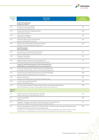 No Indeks IndexNama IndeksIndex Title HalamanPage NumberAspek Ketenagakerjaan Employment Aspect F.18 Kesetaraan Kesempatan Bekerja Equal Employment Opportunity 191F.19 Tenaga Kerja Anak Dan Tenaga Kerja Paksa Child and Forced Labor 185F.20 Upah Minimum RegionalRegional Minimum Wage 187F.21 Lingkungan Bekerja yang Layak dan Aman Decent and Safe Work Environment 192F.22 Pelatihan dan Pengembangan Kemampuan Pegawai Employee Capacity Training and Development 205Aspek Masyarakat Community Aspect F.23 Dampak Operasi Terhadap Masyarakat Sekitar Impact of Operations to Local Communities 211F.24 Pengaduan Masyarakat Community Grievances 212F.25 Kegiatan Tanggung Jawab Sosial Lingkungan (TJSL) Social and Environmental Corporate Responsibility Program 213Tanggung Jawab Pengembangan Produk/Jasa Berkelanjutan Responsibility on Sustainable Product/ Service DevelopmentF.26 Inovasi dan Pengembangan Produk/Jasa Keuangan Berkelanjutan Sustainable Financial Product/Service Innovation and Development 229F.27 Produk/Jasa yang Sudah Dievaluasi Keamanannya Bagi Pelanggan Safety-Evaluated Products/Services for Customers 228F.28 Dampak Produk/Jasa Impacts from Products/Service Innovation and Development 228F.29 Jumlah Produk yang Ditarik Kembali Number of Recalled Products 229F.30 Survei Kepuasan Pelanggan Terhadap Produk dan/atau Jasa Keuangan Berkelanjutan Customer Satisfaction Survey on Sustainable Financial Products/Services 229Lain-Lain Others G.1 Verifikasi Tertulis dari Pihak Independen (Jika Ada)Written Verification by Independent Party (if any) 29G.2 Lembar Umpan Balik Feedback 259G.3 Tanggapan Terhadap Umpan Balik Laporan Keberlanjutan Tahun SebelumnyaResponse on Feedback on the Previous Year%u2019s Sustainability Report n.aG.4 Daftar Pengungkapan Sesuai POJK No. 51/POJK.03/2017 tentang Penerapan Keuangan Berkelanjutan bagi Lembaga Jasa Keuangan, Emiten, dan Perusahaan PublikDisclosure List in Accordance with Financial Services Authority%u2019s Regulation No. 51/POJK.03/2017 on the Implementation of Sustainable Finance for financial Service Institutions and Listed Public Companies240PT Pertamina Hulu Energi %u2022 Sustainability Report 243