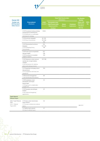 LampiranAppendixStandar GRI/Sumber LainGRI Standard/ Other Source PengungkapanDisclosure LokasiLocationYang Tidak DicantumkanOmmission No. Rujukan Standar Sektor GRIGRI Sector Standard Ref. No.SDGs No.Persyaratan yang Tidak DicantumkanRequirement(s) Omitted AlasanReasonPenjelasanExplanation2-22 Pernyataan tentang strategi pembangunan berkelanjutan2-22 Statement on sustainable development strategy 32,362-23 Komitmen kebijakan 2-23 Policy Commitment 45, 105, 131, 136, 1902-24 Menanamkan komitmen kebijakan2-24 Embedding Policy Commitment105-107, 132, 1362-25 Proses untuk memperbaiki dampak negatif2-25 Processes to remediate negative impacts 107-108, 1402-26 Mekanisme untuk mencari nasihat dan mengemukakan masalah2-26 Mechanisms for seeking advice and raising concerns 107-1082-27 Kepatuhan terhadap hukum dan peraturan2-27 Compliance with laws and regulations1052-28 Asosiasi keanggotaan2-28 Membership Associations 832-29 Pendekatan untuk keterlibatan pemangku kepentingan2-29 Approach to stakeholder engagement 912-30 Perjanjian perundingan kolektif2-30 Collective bargaining agreements 81Topik MaterialMaterial TopicsGRI 3: Topik Material 2021GRI 3 : Material Topics 20213-1 Proses untuk menentukan topik material3-1 Process to determine material topics 24GRI 11.1.13-2 Daftar topik material3-2 List of material topics 2711246 Laporan Keberlanjutan %u2022 PT Pertamina Hulu Energi