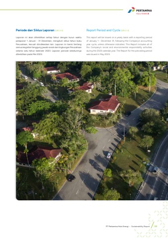 Periode dan Siklus Laporan [GRI 2-3]Laporan ini akan diterbitkan setiap tahun dengan kurun waktu pelaporan 1 Januari - 31 Desember, mengikuti siklus tahun buku Perusahaan, kecuali diindikasikan lain. Laporan ini berisi tentang semua kegiatan tanggung jawab sosial dan lingkungan Perusahaan selama satu tahun kalender 2023. Laporan periode sebelumnya diterbitkan pada Mei 2023.Report Period and Cycle [GRI 2-3]This report will be issued on a yearly basis with a reporting period of January 1 - December 31, following the Company%u2019s accounting year cycle, unless otherwise indicated. This Report includes all of the Company%u2019s social and environmental responsibility activities during the 2023 calendar year. The Report for the preceding period was issued in May 2023.PT Pertamina Hulu Energi %u2022 Sustainability Report 23