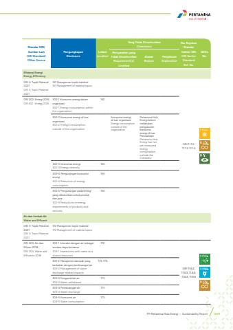 Standar GRI/Sumber LainGRI Standard/ Other Source PengungkapanDisclosure LokasiLocationYang Tidak DicantumkanOmmission No. Rujukan Standar Sektor GRIGRI Sector Standard Ref. No.SDGs No.Persyaratan yang Tidak DicantumkanRequirement(s) Omitted AlasanReasonPenjelasanExplanationEfisiensi EnergiEnergy EfficiencyGRI 3: Topik Material 2021GRI 3: Topic Material 2021161 Manajemen topik material161 Management of material topics GRI 11.1.2, 11.1.3, 11.1.4GRI 302: Energi 2016GRI 302 : Energy 2016 302-1 Konsumsi energi dalam organisasi302-1 Energy consumption within the organization 162302-2 Konsumsi energi di luar organisasi302-2 Energy consumption outside of the organization Konsumsi energi di luar organisasiEnergy consumption outside of the organization Pertamina Hulu Energi belum melakukan pengukuran konsumsi energi di luar Perusahaan.Pertamina Hulu Energi has not yet measured energy consumption outside the Company.302-3 Intensitas energi302-3 Energy intensity163302-4 Pengurangan konsumsi energi302-4 Reduction of energy consumption 163302-5 Pengurangan pada energi yang dibutuhkan untuk produk dan jasa302-5 Reductions in energy requirements of products and services 163Air dan Limbah AirWater and EffluentGRI 3: Topik Material 2021GRI 3: Topic Material 2021172 Manajemen topik material172 Management of material topicsGRI 303: Air dan Efluen 2018GRI 303: Water and Effluents 2018303-1 Interaksi dengan air sebagai sumber daya bersama303-1 Interactions with water as a shared resources172GRI 11.6.2, 11.6.3, 11.6.4, 11.6.5, 11.6.6303-2 Manajemen dampak yang berkaitan dengan pembuangan air303-2 Management of water discharge-related impacts173, 176303-3 Pengambilan air303-3 Water withdrawal173303-4 Pembuangan air303-4 Water discharge 173303-5 Konsumsi air303-5 Water consumption173PT Pertamina Hulu Energi %u2022 Sustainability Report 249
