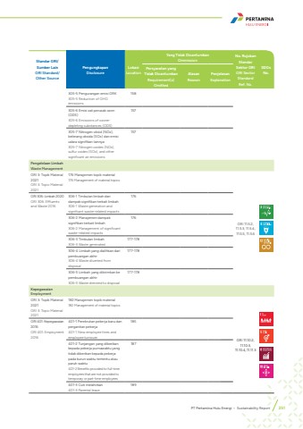 Standar GRI/Sumber LainGRI Standard/ Other Source PengungkapanDisclosure LokasiLocationYang Tidak DicantumkanOmmission No. Rujukan Standar Sektor GRIGRI Sector Standard Ref. No.SDGs No.Persyaratan yang Tidak DicantumkanRequirement(s) Omitted AlasanReasonPenjelasanExplanation305-5 Pengurangan emisi GRK305-5 Reduction of GHG emissions158305-6 Emisi zat perusak ozon (ODS)305-6 Emissions of ozonedepleting substances (ODS)157305-7 Nitrogen oksid (NOx), belerang oksida (SOx) dan emisi udara signifikan lainnya305-7 Nitrogen oxides (NOx), sulfur oxides (SOx), and other significant air emissions157Pengelolaan LimbahWaste ManagementGRI 3: Topik Material 2021GRI 3: Topic Material 2021176 Manajemen topik material176 Management of material topicsGRI 11.5.2, 11.5.3, 11.5.4, 11.5.5, 11.5.6GRI 306: Limbah 2020GRI 306: Effluents and Waste 2016 306-1 Timbulan limbah dan dampak signifikan terkait limbah306-1 Waste generation and signifcant waste-related impacts176306-2 Manajemen dampak signifikan terkait limbah306-2 Management of significant waste-related impacts 176306-3 Timbulan limbah306-3 Waste generated177-178306-4 Limbah yang dialihkan dari pembuangan akhir306-4 Waste diverted from disposal177-178306-5 Limbah yang dikirimkan ke pembuangan akhir306-5 Waste directed to disposal177-178Kepegawaian EmploymentGRI 3: Topik Material 2021GRI 3: Topic Material 2021182 Manajemen topik material182 Management of material topicsGRI 11.10.2, 11.10.3, 11.10.4, 11.11.3GRI 401: Kepegawaian 2016GRI 401: Employment 2016401-1 Perekrutan pekerja baru dan pergantian pekerja401-1 New employee hires and employee turnover185401-2 Tunjangan yang diberikan kepada pekerja purnawaktu yang tidak diberikan kepada pekerja pada kurun waktu tertentu atau paruh waktu401-2 Benefits provided to full-time employees that are not provided to temporary or part-time employees187401-3 Cuti melahirkan401-3 Parental leave189PT Pertamina Hulu Energi %u2022 Sustainability Report 251