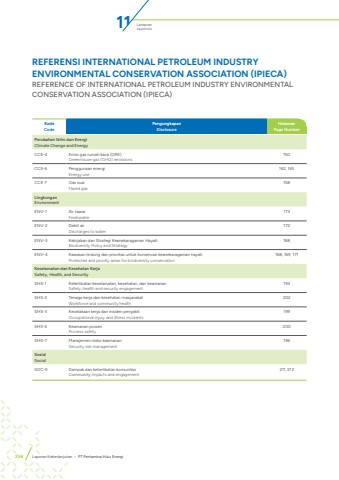 LampiranAppendixKode CodePengungkapan DisclosureHalaman Page NumberPerubahan Iklim dan EnergiClimate Change and EnergyCCE-4 Emisi gas rumah kaca (GRK)Greenhouse gas (GHG) emissions150CCE-6 Penggunaan energiEnergy use162, 165CCE-7 Gas suarFlared gas158LingkunganEnvironmentENV-1 Air tawarFreshwater173ENV-2 Debit airDischarges to water172ENV-3 Kebijakan dan Strategi Keanekaragaman HayatiBiodiversity Policy and Strategy168ENV-4 Kawasan lindung dan prioritas untuk konservasi keanekaragaman hayatiProtected and priority areas for biodiversity conservation168, 169, 171Keselamatan dan Kesehatan KerjaSafety, Health, and SecuritySHS-1 Keterlibatan keselamatan, kesehatan, dan keamananSafety, health and security engagement193SHS-2 Tenaga kerja dan kesehatan masyarakatWorkforce and community health202SHS-3 Kecelakaan kerja dan insiden penyakitOccupational injury and illness incidents199SHS-6 Keamanan prosesProcess safety200SHS-7 Manajemen risiko keamananSecurity risk management196SosialSocialSOC-9 Dampak dan keterlibatan komunitasCommunity impacts and engagement211, 212REFERENSI INTERNATIONAL PETROLEUM INDUSTRY ENVIRONMENTAL CONSERVATION ASSOCIATION (IPIECA) REFERENCE OF INTERNATIONAL PETROLEUM INDUSTRY ENVIRONMENTAL CONSERVATION ASSOCIATION (IPIECA) 11258 Laporan Keberlanjutan %u2022 PT Pertamina Hulu Energi
