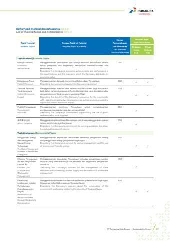 Topik MaterialMaterial TopicsKenapa Topik Ini MaterialWhy the Topic is MaterialNomor PengungkapanGRI StandardsGRI Standard Disclosure NumberBatasan TopikTopic BoundariesDi dalamInsidePHEDi luarOutsidePHETopik Ekonomi | Economic TopicsKinerja EkonomiEconomic Performance Menggambarkan pencapaian dan kinerja ekonomi Perusahaan selama tahun pelaporan dan bagaimana Perusahaan mendistribusikan nilai ekonominyaDescribing the Company%u2019s economic achievements and performance in the reporting year and the manner in which the Company distributes its economic value201%uf0fcKeberadaan PasarMarket PresenceMenggambarkan dampak ekonomi dari keberadaan PerusahaanDescribing the economic impact of the Company%u2019s presence202 %uf0fc %uf0fcDampak Ekonomi Tidak LangsungIndirect Economic ImpactMenggambarkan manfaat atas keberadaan Perusahaan bagi masyarakat baik dalam hal pembangunan infrastruktur dan jasa yang disediakan atau dampak ekonomi tidak langsung yang signifikanDescribing the benefit of the Company%u2019s presence for the community, with regard to infrastructure development as well as services provided or significant indirect economic impact203%uf0fc %uf0fcPraktik PengadaaanProcurement PracticesMenggambarkan komitmen Perusahaan untuk mengedepankan penggunaan barang dan jasa dari pemasok lokalDescribing the Company%u2019s commitment to prioritizing the use of goods and services of local suppliers204%uf0fcAnti KorupsiAnti-CorruptionMenggambarkan komitmen Perusahaan untuk menyelenggarakan operasi secara bersih, jujur dan transparanDescribing the Company%u2019s commitment to running operations in a clean, honest and transparent manner205%uf0fcTopik Lingkungan | Environmental TopicsPenggunaan Energi dan Peningkatan Bauran Energi TerbarukanThe Use of Energy and Increase of Renewable Energy mixMenggambarkan kepedulian Perusahaan terhadap pengelolaan energi dan penggunaan energi yang ramah lingkunganDescribing the Company%u2019s concern for energy management and the use of environment-friendly energy 302 %uf0fc %uf0fcEfisiensi Penggunaan Air dan Pengelolaan Limbah AirEfficient Use of Water and Wastewater ManagementMenggambarkan kepedulian Perusahaan terhadap pengelolaan sumber daya air yang ketersediannya kian terbatas dan bagaimana pengelolaan limbah airDescribing the Company%u2019s concern for the management of water resources with increasingly limited supply and the method of wastewater management303 %uf0fcKelestarian Lingkungan melalui Perlindungan Keanekaragaman HayatiPreservation of the Environment through Biodiversity ConservationMenggambarkan kepedulian Perusahaan terhadap kelestarian lingkungan, khususnya terkait keberagaman flora dan faunaDescribing the Company%u2019s concern about the preservation of the environment, particularly related to the diversity of flora and fauna304 %uf0fc %uf0fcDaftar topik material dan batasannya [GRI 3-2] List of material topics and its boundaries [GRI 3-2] PT Pertamina Hulu Energi %u2022 Sustainability Report 27
