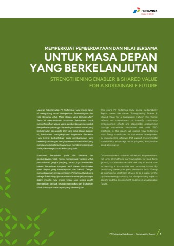 MEMPERKUAT PEMBERDAYAAN DAN NILAI BERSAMA UNTUK MASA DEPAN YANG BERKELANJUTAN STRENGTHENING ENABLER & SHARED VALUEFOR A SUSTAINABLE FUTURELaporan Keberlanjutan PT Pertamina Hulu Energi tahun ini mengusung tema \Nilai Bersama untuk Masa Depan yang Berkelanjutan\Tema ini mencerminkan komitmen Perusahaan untuk mengintensifkan upaya-upaya pemberdayaan masyarakat dan pelibatan pemangku kepentingan melalui inovasi yang berkelanjutan dan praktik LST yang solid. Dalam laporan ini, Perusahaan mengeksplorasi bagaimana Pertamina Hulu Energi berkontribusi pada pembangunan yang berkelanjutan dengan mengimplementasikan inisiatif yang mendukung kelestarian lingkungan, mendorong kemajuan sosial, dan mengatur tata kelola yang baik.Komitmen Perusahaan pada nilai bersama dan pemberdayaan tidak hanya memperkuat fondasi untuk pertumbuhan jangka panjang, tetapi juga memastikan bahwa Perusahaan berperan aktif dalam menciptakan masa depan yang berkelanjutan dan inklusif. Dengan mengedepankan prinsip-prinsip ini, Pertamina Hulu Energi sebagai Subholding Upstream berusaha menjadi pemimpin dalam industri hulu energi, tetapi juga secara positif memberikan dampak kepada masyarakat dan lingkungan untuk mencapai masa depan yang berkelanjutan.This year's PT Pertamina Hulu Energi Sustainability Report carries the theme \Shared Value for a Sustainable Future\reflects our commitment to intensify community empowerment efforts and stakeholder engagement through sustainable innovation and solid ESG practices. In this report, we explore how Pertamina Hulu Energi contributes to sustainable development by implementing initiatives that support environmental sustainability, encourage social progress, and provide good governance.Our commitment to shared values and empowerment not only strengthens our foundation for long-term growth, but also ensures that we play an active role in creating a sustainable and inclusive future. By prioritizing these principles, Pertamina Hulu Energi as Subholding Upstream strives to be a leader in the upstream energy industry, but also positively impacts society and the environment to achieve a sustainable future.HULU ENERGIPT Pertamina Hulu Energi %u2022 Sustainability Report 1