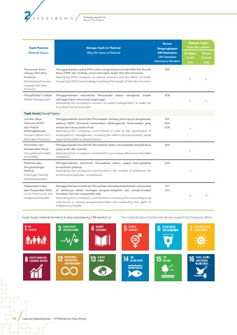 23 4 5 6 7 8 9 10 11 Tentang Laporan IniAbout This ReportTopik MaterialMaterial TopicsKenapa Topik Ini MaterialWhy the Topic is MaterialNomor PengungkapanGRI StandardsGRI Standard Disclosure NumberBatasan TopikTopic BoundariesDi dalamInsidePHEDi luarOutsidePHEPenurunan Emisi menuju Net Zero EmissionDecreasing Emission towards Net Zero EmissionMenggambarkan upaya PHE untuk mengurangi emisi dan efek Gas Rumah Kaca (GRK) dan strategi untuk mencapai target Net Zero EmissionDescribing PHE%u2019s endeavor to reduce emission and the effect of Green House Gas (GHG) and strategy to achieve the target of Net Zero Emission305%uf0fc %uf0fcPengelolaan LimbahWaste ManagementMenggambarkan kepedulian Perusahaan dalam mengelola limbah sehingga tidak mencemari lingkungan Describing the Company%u2019s concern for waste management in order not to pollute the environment306 %uf0fc %uf0fcTopik Sosial | Social TopicsSumber Daya Manusia (SDM) dan Praktik KetenagakerjaanHuman Capital (HC) and Labor PracticesMenggambarkan komitmen Perusahaan tentang pentingnya pengelolaan pekerja /SDM, termasuk memastikan keberagaman, kesempatan yang setara dan tanpa diskriminasiDescribing the Company%u2019s commitment in view of the significance of employee/HC management, including the need to ensure diversity, equal opportunity without discrimination401 405 406 %uf0fcKesehatan dan Keselamatan Kerja Occupational Health and Safety Menggambarkan komitmen Perusahaan dalam menyediakan tempat kerja yang aman dan nyamanDescribing the Company%u2019s commitment in providing safe and comfortable workplace403 %uf0fcPelatihan dan Pengembangan PekerjaEmployee Training and DevelopmentMenggambarkan komitmen Perusahaan dalam upaya meningkatkan kompetensi pekerja Describing the Company%u2019s commitment in the context of endeavors for enhancing employees%u2019 competence404 %uf0fcMasyarakat Lokaldan Masyarakat Adat Local Community and Indigenous PeoplesMenggambarkan komitmen Perusahaan terhadap keterlibatan masyarakat di sekitarnya dalam berbagai program/kegiatan dan penghormatan terhadap hak-hak masyarakat adatDescribing the Company%u2019s commitment to involving the surrounding local community in various programs/activities and respecting the rights of Indigenous peoples411413 %uf0fc %uf0fcTopik-topik material tersebut di atas mendukung TPB berikut ini: The material topics mentioned above support the following SDGs:28 Laporan Keberlanjutan %u2022 PT Pertamina Hulu Energi