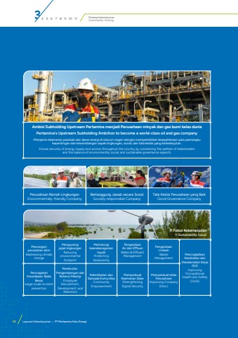 Strategi Keberlanjutan 3Sustainability Strategy 4 5 6 7 8 9 10 1134 Laporan Keberlanjutan %u2022 PT Pertamina Hulu EnergiAmbisi Subholding Upstream Pertamina menjadi Perusahaan minyak dan gas bumi kelas duniaPertamina's Upstream Subholding Ambition to become a world-class oil and gas companyMenjamin keamanan pasokan dan akses energi di seluruh negeri dengan memperhatikan kesejahteraan para pemangku kepentingan dan keseimbangan aspek lingkungan, sosial, dan tata kelola yang berkelanjutan.Ensure security of energy supply and access throughout the country by considering the welfare of stakeholders and the balance of environmental, social, and sustainable governance aspects.Perusahaan Ramah LingkunganEnvironmentally-friendly CompanyBertanggung Jawab secara SosialSocially-responsible CompanyTata Kelola Perusahaan yang BaikGood Governance CompanyMenanganiperubahan iklimAddressing climate changeMengurangijejak lingkunganReducing environmental footprintMelindungikeanekaragaman hayatiProtecting biodiversityPengelolaanAir dan EffluenWater & Effluent ManagementPengelolaan LimbahWaste ManagementMeningkatkan Kesehatan dan Keselamatan Kerja (K3)Improving Occupational Health and Safety (OHS)PencegahanKecelakaan Skala BesarLarge-scale incident preventionPerekrutan, Pengembangan dan Retensi PekerjaEmployee Recruitment, Development, and Retention Keterlibatan dan Dampak KomunitasCommunity EmpowermentMemperkuatKeamanan SiberStrengthening Digital SecurityMemperkuat etikaPerusahaanImproving Company Ethics34 Laporan Keberlanjutan %u2022 PT Pertamina Hulu Energi11 Fokus Keberlanjutan11 Sustainability Focus