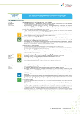 Pilar LST dan Strategi KeberlanjutanESG's Pillar andSustainability StrategyInisiasi Keberlanjutan dan Kontribusi PHE terhadap Tujuan Pembangunan Berkelanjutan (TPB)Sustainability Initiation and PHE's Contribution to the Sustainable Development Goals (SDGs)I. Pilar Lingkungan/ Environmental PillarMenangani perubahan iklimAddressing climate changesMeningkatkan Efisiensi Energi dan Penggunaan Sumber Energi Terbarukan%u2022 Melakukan efisiensi energi di cakupan Wilayah Kerja PHE Subholding Upstream. Sepanjang tahun 2023, PHE Subholding Upstream telah berhasil mereduksi energi sejumlah 3.887.062,07 MWh/tahun.%u2022 Melanjutkan program Desa Energi Berdikari (DEB) untuk terus meningkatkan pemanfaatan sumber energi baru terbarukan berbasis program CID. Sepanjang tahun 2023, sebanyak 15 program DEB terlaksana dengan total kapasitas panel surya terpasang sebesar 70,69 kWp dan pemanfaatan kotoran hewan dalam reaktor biogas dengan kapasitas sebesar 165m3.Improving Energy Efficiency and Use of Renewable Energy Sources%u2022 Carrying out energy efficiency within the scope of Pertamina's Subholding Upstream Work Area. In 2023, PHE Subholding Upstream successfully reduced energy by a total of 3,887,062.07 MWh per year.%u2022 Continuing the Desa Energi Berdikari (DEB) program to continue to increase the use of new renewable energy sources based on the CID program. In 2023, a total of 15 DEB programs were implemented with a total installed solar panel capacity of 70.69 kWp and the utilization of animal waste in biogas reactors with a capacity of 165m3.Menurunkan Tingkat Emisi menuju Net Zero Emission%u2022 Mengembangkan dan menyelesaikan peta jalan net zero emission dengan capaian 2023 yakni 872.495,58 ton CO2eq%u2022 Melakukan aktivitas program dekarbonisasi melalui inisiatif efisiensi energi, non rutin emisi, energi rendah karbon, heatingrendah karbon, dan rencana sertifikasi Nature Based Solution.%u2022 Melalui program CID, PHE Subholding Upstream juga berinisiatif untuk terus menurunkan emisi karbondioksida. Sepanjang tahun 2023, Perusahaan telah mereduksi sebesar 109.235 ton CO2eq/tahun yang berasal dari aktivitas penanaman tanaman darat maupun air, konservasi lahan, pengelolaan sampah organik dan anorganik.Reducing Emissions to Net Zero Emissions%u2022 Develop and complete a net zero emission roadmap with 2023 achievements of 872,495.58 tons CO2eq. %u2022 Engaging in decarbonization activities through initiatives such as energy efficiency, non-routine emissions, low-carbon energy, low-carbon heating, and Nature Based Solution certification plans. %u2022 Through the CID program, PHE Subholding Upstream also took the initiative to continue to reduce carbon dioxide emissions. In 2023, the Company has reduced 109,235 tons CO2eq/year from land and water plant planting activities, land conservation, organic and inorganic waste management.Mengurangi jejak lingkunganReduce environmental footprintMelakukan Pengelolaan dan Menjalankan Proses Produksi yang Bertanggung Jawab%u2022 Sertifikasi ISO 14001:2015 Sistem Manajemen Lingkungan terhadap Anak Perusahaan dan Wilayah Kerja.%u2022 Implementasi Business Continuity Management System (BCMS) berdasarkan ISO 22301:2019.Managing and Operating Responsible Production Processes%u2022 ISO 14001:2015 Environmental Management System Certification for Subsidiaries and Working Areas. %u2022 Implementation of Business Continuity Management System (BCMS) based on ISO 22301:2019.Melindungi keanekaragamanhayatiProtecting biodiversityMelakukan Penghijauan dan Konservasi%u2022 Berada dalam satu kabupaten dengan Kawasan Ujung Tamiang, pada tahun 2023, Rantau Field fokus pada penanaman flora untuk menunjang habitat Tuntong Laut. %u2022 PEP Field Sanga-Sanga melaksanakan konservasi Bekantan, hewan endemik Delta Mahakam, Kalimantan. %u2022 Melalui Blue Carbon Initiative, pada tahun 2023, Perusahaan telah melakukan penanaman mangrove sejumlah 580.044 di wilayah Delta Mahakam dan 450.000 di Pesisir Bontang. Program ini juga fokus pada konservasi keanekaragaman hayati, termasuk perlindungan hewan endemik dan mendukung peningkatan energi bersih serta akses air bersih melalui peningkatan infrastruktur. %u2022 PHE Subholding Upstream telah melestarikan 9 fauna dalam status terancam punah, jumlah ini meningkat dari tahun sebelumnya. %u2022 Melalui program CID, PHE Subholding Upstream telah melaksanakan kegiatan penghijauan dengan menanam sekitar 250 ribu baik tanaman darat maupun air, konservasi lahan sebanyak 1.200 ha di sejumlah wilayah kerja, serta konservasi fauna seperti Gajah, Macan Dahan, Penyu, Owa Jawa, Bekantan, Terumbu Karang, dan Gagak Banggai.Greening and Conservation%u2022 Located in the same regency as the Ujung Tamiang Area, in 2023, Rantau Field focused on planting flora to support the habitat of Painted Terrapin.%u2022 PEP Field Sanga-Sanga carried out the conservation of proboscis monkey, an endemic animal of the Mahakam Delta, Kalimantan.%u2022 Through the Blue Carbon Initiative, in 2023, the Company planted 580,044 mangroves in the Mahakam Delta area and 450,000 mangroves along the Bontang Coast. This program also focuses on biodiversity conservation, including the protection of endemic animals, and supports the enhancement of clean energy and clean water access through infrastructure improvements.%u2022 PHE Subholding Upstream has preserved 9 fauna species classified as endangered, an increase from the previous year. %u2022 Through the CID program, PHE Subholding Upstream has carried out reforestation activities by planting around 250 thousand both land and water plants, land conservation of 1,200 ha in a number of work areas, and conservation of fauna such as Elephants, Clouded Leopards, Sea Turtles, Javan Gibbons, Proboscis Monkeys, Coral Reefs, and Banggai Crows.PT Pertamina Hulu Energi %u2022 Sustainability Report 37