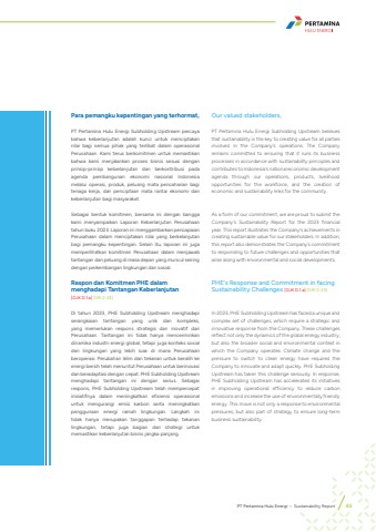 Para pemangku kepentingan yang terhormat, PT Pertamina Hulu Energi Subholding Upstream percaya bahwa keberlanjutan adalah kunci untuk menciptakan nilai bagi semua pihak yang terlibat dalam operasional Perusahaan. Kami terus berkomitmen untuk memastikan bahwa kami menjalankan proses bisnis sesuai dengan prinsip-prinsip keberlanjutan dan berkontribusi pada agenda pembangunan ekonomi nasional Indonesia melalui operasi, produk, peluang mata pencaharian bagi tenaga kerja, dan penciptaan mata rantai ekonomi dan keberlanjutan bagi masyarakat. Sebagai bentuk komitmen, bersama ini dengan bangga kami menyampaikan Laporan Keberlanjutan Perusahaan tahun buku 2023. Laporan ini menggambarkan pencapaian Perusahaan dalam menciptakan nilai yang berkelanjutan bagi pemangku kepentingan. Selain itu, laporan ini juga memperlihatkan komitmen Perusahaan dalam menjawab tantangan dan peluang di masa depan yang muncul seiring dengan perkembangan lingkungan dan sosial. Respon dan Komitmen PHE dalam menghadapi Tantangan Keberlanjutan [OJK D.1.a] [GRI 2-23]Di tahun 2023, PHE Subholding Upstream menghadapi serangkaian tantangan yang unik dan kompleks, yang memerlukan respons strategis dan inovatif dari Perusahaan. Tantangan ini tidak hanya mencerminkan dinamika industri energi global, tetapi juga konteks sosial dan lingkungan yang lebih luas di mana Perusahaan beroperasi. Perubahan iklim dan tekanan untuk beralih ke energi bersih telah menuntut Perusahaan untuk berinovasi dan beradaptasi dengan cepat. PHE Subholding Upstream menghadapi tantangan ini dengan serius. Sebagai respons, PHE Subholding Upstream telah mempercepat inisiatifnya dalam meningkatkan efisiensi operasional untuk mengurangi emisi karbon serta meningkatkan penggunaan energi ramah lingkungan. Langkah ini tidak hanya merupakan tanggapan terhadap tekanan lingkungan, tetapi juga bagian dari strategi untuk memastikan keberlanjutan bisnis jangka panjang. Our valued stakeholders, PT Pertamina Hulu Energi Subholding Upstream believes that sustainability is the key to creating value for all parties involved in the Company's operations. The Company remains committed to ensuring that it runs its business processes in accordance with sustainability principles and contributes to Indonesia's national economic development agenda through our operations, products, livelihood opportunities for the workforce, and the creation of economic and sustainability links for the community. As a form of our commitment, we are proud to submit the Company's Sustainability Report for the 2023 financial year. This report illustrates the Company's achievements in creating sustainable value for our stakeholders. In addition, this report also demonstrates the Company%u2019s commitment to responding to future challenges and opportunities that arise along with environmental and social developments. PHE's Response and Commitment in facing Sustainability Challenges [OJK D.1.a] [GRI 2-23]In 2023, PHE Subholding Upstream has faced a unique and complex set of challenges, which require a strategic and innovative response from the Company. These challenges reflect not only the dynamics of the global energy industry, but also the broader social and environmental context in which the Company operates. Climate change and the pressure to switch to clean energy have required the Company to innovate and adapt quickly. PHE Subholding Upstream has taken this challenge seriously. In response, PHE Subholding Upstream has accelerated its initiatives in improving operational efficiency to reduce carbon emissions and increase the use of environmentally friendly energy. This move is not only a response to environmental pressures, but also part of strategy to ensure long-term business sustainability. PT Pertamina Hulu Energi %u2022 Sustainability Report 45