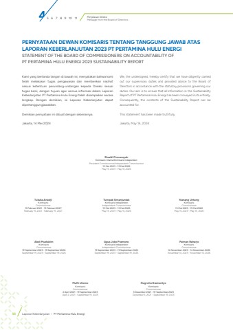 Penjelasan DireksiMessage from the Board of DirectorsPERNYATAAN DEWAN KOMISARIS TENTANG TANGGUNG JAWAB ATAS LAPORAN KEBERLANJUTAN 2023 PT PERTAMINA HULU ENERGISTATEMENT OF THE BOARD OF COMMISSIONERS ON ACCOUNTABILITY OF PT PERTAMINA HULU ENERGI 2023 SUSTAINABILITY REPORTKami yang bertanda tangan di bawah ini, menyatakan bahwa kami telah melakukan tugas pengawasan dan memberikan nasihat sesuai ketentuan perundang-undangan kepada Direksi sesuai tugas kami, dengan tujuan agar semua informasi dalam Laporan Keberlanjutan PT Pertamina Hulu Energi telah disampaikan secara lengkap. Dengan demikian, isi Laporan Keberlanjutan dapat dipertanggungjawabkan. Demikian pernyataan ini dibuat dengan sebenarnya. Jakarta, 14 Mei 2024We, the undersigned, hereby certify that we have diligently carried out our supervisory duties and provided advice to the Board of Directors in accordance with the statutory provisions governing our duties. Our aim is to ensure that all information in the Sustainability Report of PT Pertamina Hulu Energi has been conveyed in its entirety. Consequently, the contents of the Sustainability Report can be accounted for.This statement has been made truthfully. Jakarta, May 14, 2024Rinaldi FirmansyahKomisaris Utama/Komisaris IndependenPresident Commissioner/Independent Commissioner15 Mei 2023 - 15 Mei 2026May 15, 2023 - May 15, 2026Mufti UtomoKomisarisCommissioner2 April 2021 - 19 September 2023April 2, 2021 - September 19, 2023Nugroho BramantyoKomisarisCommissioner3 Desember 2021 - 19 September 2023December 3, 2021 - September 19, 2023Tumpak SimanjuntakKomisaris IndependenIndependent Commissioner15 Mei 2023 - 15 Mei 2026May 15, 2023 - May 15, 2026Tutuka AriadjiKomisarisCommissioner15 Februari 2021 - 15 Februari 2027February 15, 2021 - February 15, 2027Agus Joko PramonoKomisaris IndependenIndependent Commissioner19 September 2023 - 19 September 2026September 19, 2023 - September 19, 2026Paiman RaharjoKomisarisCommissioner14 November 2023 - 14 November 2026November 14, 2023 - November 14, 2026Nanang UntungKomisarisCommissioner15 Mei 2023 - 15 Mei 2026May 15, 2023 - May 15, 2026Abdi MustakimKomisarisCommissioner19 September 2023 - 19 September 2026September 19, 2023 - September 19, 202645 6 7 8 9 10 1156 Laporan Keberlanjutan %u2022 PT Pertamina Hulu Energi