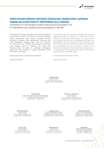 PERNYATAAN DIREKSI TENTANG TANGGUNG JAWAB ATAS LAPORAN KEBERLANJUTAN 2023 PT PERTAMINA HULU ENERGISTATEMENT OF THE BOARD OF DIRECTORS ON ACCOUNTABILITY OF PT PERTAMINA HULU ENERGI 2023 SUSTAINABILITY REPORT Sesuai prinsip tata kelola perusahaan yang baik dan Peraturan yang berlaku di Indonesia, PT Pertamina Hulu Energi menerbitkan Laporan Keberlanjutan 2023. Laporan menyajikan informasi Perusahaan mengenai kinerja keberlanjutan, penerapan tata kelola, pelaksanaan tanggung jawab sosial serta informasi lain yang relevan dan signifikan bagi pemangku kepentingan. Kami, segenap Direksi PT Pertamina Hulu Energi yang bertanda tangan di bawah ini menyatakan bertanggung jawab penuh atas kebenaran isi Laporan Keberlanjutan 2023 PT Pertamina Hulu Energi. Demikian pernyataan ini dibuat dengan sebenarnya. Jakarta, 14 Mei 2024In accordance with good corporate governance principles and applicable regulations in Indonesia, PT Pertamina Hulu Energi publishes the 2023 Sustainability Report. The report presents the Company's information on its sustainability performance, the implementation of good corporate governance, corporate social responsibility, as well as other relevant and significant information to our stakeholders. We, the entire Board of Directors of PT Pertamina Hulu Energi who have signed below, hereby state our full responsibility for the validity of the content of PT Pertamina Hulu Energi 2023 Sustainability Report. This statement has been made truthfully. Jakarta, May 14, 2024Wiko MigantoroDirektur UtamaChief Executive Officer15 Maret 2022 - 31 Januari 2024March 15, 2022 - January 31, 2024Danar DojoadhiDirektur Perencanaan Strategis & Pengembangan BisnisDirector of Strategic Planning & Business Development27 Oktober 2021 - 27 Oktober 2024October 27, 2021 - October 27, 2024Awang LazuardiDirektur Pengembangan & ProduksiDirector of Development & Production27 September 2022 - 27 September 2025September 27, 2022 - September 27, 2025Muharram J. PangurisengDirektur EksplorasiDirector of Exploration27 September 2022 - 27 September 2025September 27, 2022 - September 27, 2025Oto GurnitaDirektur SDM & Penunjang BisnisDirector of HC & Corporate Services5 Mei 2021 - 20 Februari 2024May 5, 2021 - February 20, 2024Whisnu BahriansyahDirektur SDM & Penunjang BisnisDirector of HC & Corporate Services20 Februari 2024 - 20 Februari 2027February 20, 2024 - February 20, 2027Harry M. ZenDirektur KeuanganDirector of Finance16 Juli 2020 - 20 Februari 2024July 16, 2020 - February 20, 2024Dannif DanusaputroDirektur KeuanganDirector of Finance20 Februari 2024 - 20 Februari 2027February 20, 2024 - February 20, 2027Chalid Said SalimDirektur UtamaChief Executive Officer20 Februari 2024 - 20 Februari 2027February 20, 2024 - February 20, 2027PT Pertamina Hulu Energi %u2022 Sustainability Report 57