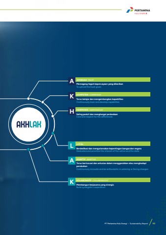 AMANAH TRUSTMemegang teguh kepercayaan yang diberikanTo uphold the trust givenAKOMPETEN COMPETENTTerus belajar dan mengembangkan kapabilitasContinuously learn and develop capabilitiesKHARMONIS HARMONIOUSSaling peduli dan menghargai perbedaanCare and respect for the differencesHLOYAL Berdedikasi dan mengutamakan kepentingan bangsa dan negaraDedicated and prioritize the interest of the nation and the stateLADAPTIF ADAPTIVETerus berinovasi dan antusias dalam menggerakkan atau menghadapi perubahanContinuously innovate and be enthusiastic in ushering or facing changesAKOLABORATIF COLLABORATIVEMembangun kerjasama yang sinergisBuild synergistic cooperationKPT Pertamina Hulu Energi %u2022 Sustainability Report 65