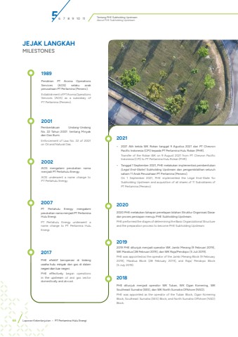 Tentang PHE Subholding UpstreamAbout PHE Subholding UpstreamJEJAK LANGKAHMILESTONES2020 PHE melakukan tahapan penetapan bilahan Struktur Organisasi Dasar dan proses persiapan menuju PHE Subholding Upstream.PHE performed the stages of determining the Basic Organizational Structure and the preparation process to become PHE Subholding Upstream.20202019 PHE ditunjuk menjadi operator WK Jambi Merang (9 Februari 2019), WK Maratua (28 Februari 2019), dan WK Raja/Pendopo (5 Juli 2019).PHE was appointed as the operator of the Jambi Merang Block (9 February 2019), Maratua Block (28 February 2019), and Raja/ Pendopo Block (5 July 2019).2019PHE ditunjuk menjadi operator WK Tuban, WK Ogan Komering, WK Southeast Sumatra (SES), dan WK North Sumatra Offshore (NSO).PHE was appointed as the operator of the Tuban Block, Ogan Komering Block, Southeast Sumatra (SES) Block, and North Sumatra Offshore (NSO) Block.2018PT Pertahulu Energy mengalami perubahan nama menjadi PT Pertamina Hulu Energi.PT Pertahulu Energy underwent a name change to PT Pertamina Hulu Energi.2007Pendirian PT Aroma Operations Services (AOS) selaku anak perusahaan PT Pertamina (Persero).Establishment of PT Aroma Operations Services (AOS) as a subsidiary of PT Pertamina (Persero).1989Pemberlakuan Undang-Undang No. 22 Tahun 2001 tentang Minyak dan Gas Bumi.Enforcement of Law No. 22 of 2001 on Oil and Natural Gas.2001%u2022 2021 Alih kelola WK Rokan tanggal 9 Agustus 2021 dari PT Chevron Pacific Indonesia (CPI) kepada PT Pertamina Hulu Rokan (PHR).Transfer of the Rokan WK on 9 August 2021 from PT Chevron Pacific Indonesia (CPI) to PT Pertamina Hulu Rokan (PHR).%u2022 Tanggal 1 September 2021, PHE melakukan implementasi pembentukan(Legal End-State) Subholding Upstream dan pengambilalihan seluruh saham 11 Anak Perusahaan PT Pertamina (Persero).On 1 September 2021, PHE implemented the Legal End-State for Subholding Upstream and acquisition of all shares of 11 Subsidiaries of PT Pertamina (Persero).2021PHE efektif beroperasi di bidang usaha hulu minyak dan gas di dalam negeri dan luar negeri.PHE effectively began operations in the upstream oil and gas sector domestically and abroad.2017AOS mengalami perubahan nama menjadi PT Pertahulu Energy.AOS underwent a name change to PT Pertahulu Energy.200256 7 8 9 10 1166 Laporan Keberlanjutan %u2022 PT Pertamina Hulu Energi