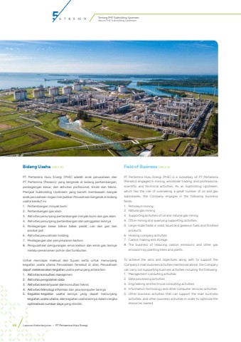 Tentang PHE Subholding UpstreamAbout PHE Subholding UpstreamBidang Usaha [GRI 2-6]PT Pertamina Hulu Energi (PHE) adalah anak perusahaan dari PT Pertamina (Persero) yang bergerak di bidang pertambangan, perdagangan besar, dan aktivitas profesional, ilmiah dan teknis. Menjadi Subholding Upstream yang berarti membawahi banyak anak perusahaan migas menjadikan Perusahaan bergerak di bidang usaha berikut ini: 1. Pertambangan minyak bumi2. Pertambangan gas alam3. Aktivitas penunjang pertambangan minyak bumi dan gas alam 4. Aktivitas penunjang pertambangan dan penggalian lainnya5. Perdagangan besar bahan bakar padat, cair dan gas dan produk jadi 6. Aktivitas perusahaan holding7. Perdagangan dan penyimpanan karbon 8. Pengusahaan pengurangan emisi karbon dan emisi gas lainnya melalui penanaman pohon dan tumbuhan.Untuk mencapai maksud dan tujuan serta untuk menunjang kegiatan usaha utama Perusahaan tersebut di atas, Perusahaan dapat melaksanakan kegiatan usaha penunjang antara lain:1. Aktivitas konsultasi manajemen2. Aktivitas pengolahan data3. Aktivitas keinsinyuran dan konsultasi teknis4. Aktivitas teknologi informasi dan jasa komputer lainnya5. Kegiatan-kegiatan usaha lainnya yang dapat menunjang kegiatan usaha utama, dan kegiatan usaha lainnya dalam rangka optimalisasi sumber daya yang dimiliki.Field of Business [GRI 2-6]PT Pertamina Hulu Energi (PHE) is a subsidiary of PT Pertamina (Persero) engaged in mining, wholesale trading, and professional, scientific and technical activities. As an Subholding Upstream, which has the role of overseeing a great number of oil and gas subsidiaries, the Company engages in the following business fields: 1. Petroleum mining2. Natural gas mining3. Supporting activities of oil and natural gas mining 4. Other mining and quarrying supporting activities.5. Large-scale trade in solid, liquid and gaseous fuels and finished products 6. Holding company activities 7. Carbon trading and storage8. The business of reducing carbon emissions and other gas emissions by planting trees and plants.To achieve the aims and objectives along with to support the Company's main business activities mentioned above, the Company can carry out supporting business activities including the following:1. Management consulting activities2. Data processing activities3. Engineering and technical consulting activities4. Information technology and other computer services activities5. Other business activities that can support the main business activities, and other business activities in order to optimize the resources owned.56 7 8 9 10 1168 Laporan Keberlanjutan %u2022 PT Pertamina Hulu Energi