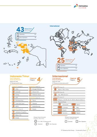 Indonesia TimurEast IndonesiaArea 62.942 km2Regional Lead:PT Pertamina EP CepuZona 11 | Zone 11 Zona 13 | Zone 13R Cepu U Donggi MatindokS Sukowati 38 Senoro TolliT Poleng 39 Makassar Strait31 ADK Zona 14 | Zone 1432 Randugunting V Papua33 Tuban East Java 40 Salawati34 WMO 41 Kepala BurungZona 12 | Zone 12 42 Masela35 Jambaran Tiung Biru36 Banyu Urip37 BungaRegionalRegionZona 15 | Zone 15Algeria : Block 450aZona 16 | Zone 16Iraq : West Qurna-1Zona 17 | Zone 17Malaysia : SK 309, SK 311, SK314, Block K, Block HMaurel et PromVenezuela GabonColombia ItalyAngola FranceTanzania NigeriaRegionalRegionInternasionalInternationalArea 12.243 km2Regional Lead:PT Pertamina International EPInternationalOperator 25Non-Operator 1843 Wilayah KerjaWork Areas25 Wilayah KerjaWork AreasOperator 12Non-Operator 13Wilayah Kerja Domestik:Domestic Work Area: Wilayah Kerja Internasional:International Work Area: Operator Non-Operator43 A-V: WK PT Pertamina EP4041V42Operator Non-OperatorPT Pertamina Hulu Energi %u2022 Sustainability Report 71