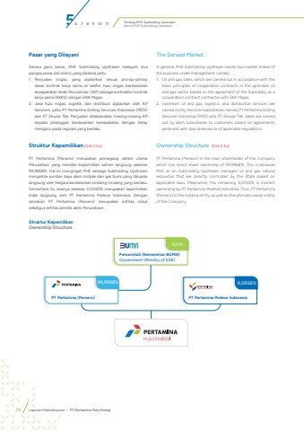 Tentang PHE Subholding UpstreamAbout PHE Subholding UpstreamPasar yang DilayaniSecara garis besar, PHE Subholding Upstream melayani dua pangsa pasar dari bisnis yang dikelola yaitu:1. Penjualan migas, yang dijalankan sesuai prinsip-prinsip dasar kontrak kerja sama di sektor hulu migas berdasarkan kesepakatan Anak Perusahaan (AP) sebagai kontraktor kontrak kerja sama (KKKS) dengan SKK Migas.2. Jasa hulu migas, logistik, dan distribusi dijalankan oleh AP Services, yaitu PT Pertamina Drilling Services Indonesia (PDSI) dan PT Elnusa Tbk. Penjualan dilaksanakan masing-masing AP kepada pelanggan berdasarkan kesepakatan dengan tetap mengacu pada regulasi yang berlaku.The Served MarketIn general, PHE Subholding Upstream serves two market shares of the business under management, namely:1. Oil and gas sales, which are carried out in accordance with the basic principles of cooperation contracts in the upstream oil and gas sector based on the agreement of the Subsidiary as a cooperation contract contractor with SKK Migas.2. Upstream oil and gas, logistics, and distribution services are carried out by Services subsidiaries, namely PT Pertamina Drilling Services Indonesia (PDSI) and PT Elnusa Tbk. Sales are carried out by each subsidiaries to customers based on agreements while and with due observance of applicable regulations.Struktur Kepemilikan [OJK C.3.c]PT Pertamina (Persero) merupakan pemegang saham utama Perusahaan yang memiliki kepemilikan saham langsung sebesar 99,9968%. Hal ini mengingat PHE sebagai Subholding Upstream mengelola sumber daya alam minyak dan gas bumi yang dikuasai langsung oleh Negara berdasarkan Undang-Undang yang berlaku. Sementara itu sisanya sebesar 0,0032% merupakan kepemilikan tidak langsung oleh PT Pertamina Pedeve Indonesia. Dengan demikian PT Pertamina (Persero) merupakan entitas induk sekaligus entitas pemilik akhir Perusahaan. Ownership Structure [OJK C.3.c]PT Pertamina (Persero) is the main shareholder of the Company which has direct share ownership of 99.9968%. This is because PHE as an Subholding Upstream manages oil and gas natural resources that are directly controlled by the State based on applicable laws. Meanwhile, the remaining 0.0032% is indirect ownership by PT Pertamina Pedeve Indonesia. Thus, PT Pertamina (Persero) is the holding entity as well as the ultimate owner entity of the Company. 56 7 8 9 10 1172 Laporan Keberlanjutan %u2022 PT Pertamina Hulu EnergiPemerintah (Kementrian BUMN)Government (Ministry of SOE)100%PT Pertamina (Persero)99,9968%PT Pertamina Pedeve Indonesia0,0032%Struktur KepemilikanOwnership Structure