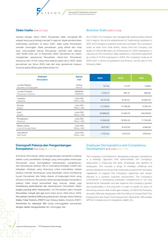 Tentang PHE Subholding UpstreamAbout PHE Subholding UpstreamSkala Usaha [OJK C.3, C.3.a]Sampai dengan tahun 2023, Perusahaan telah mengelola 68 wilayah kerja yang terbagi menjadi 5 regional. Sejak pembentukan Subholding Upstream di tahun 2021, skala usaha Perusahaan semakin meningkat. Skala perusahaan, yang dilihat dari total aset, menunjukkan bahwa Perusahaan memiliki aset sebesar USD 30,89 miliar per 31 Desember 2023. Sementara itu, dalam menjalankan operasional Perusahaan sehari-hari, Perusahaan didukung oleh 14.154 orang total pekerja pada tahun 2023. Skala perusahaan per tahun 2023, baik dari segi operasional maupun finansial dapat dilihat pada tabel berikut ini:Business Scale [OJK C.3, C.3.a]As of 2023, the Company has managed 68 working areas divided into 5 regions. Since the establishment of Subholding Upstream in 2021, the Company's business scale has increased. The company's scale, as seen from total assets, shows that the Company has assets of USD 30.89 billion as of December 31, 2023. Meanwhile, in carrying out the Company's daily operations, it has been supported by a total of 14,154 employees in 2023. The company's scale as of 2023, both in terms of operations and finance, can be seen in the following table:DeskripsiDescriptionSatuanUnit 2023 2022 2021Jumlah Pekerja Number of Employees OrangPerson 14.154 14.137 14.856Jumlah Produksi Production Volume MBOEPDMBOEPD 1.043,73 967,37 896,65LiabilitasLiabilitiesJuta USDMillion USD 16.710,36 16.323,51 15.087,00Ekuitas Equity Juta USDMillion USD 14.178,56 15.158,28 13.391,59Aset AssetsJuta USDMillion USD 30.888,92 31.481,79 28.478,59Pendapatan RevenueJuta USDMillion USD 14.568,38 16.183,40 11.740,08Beban Usaha Cost of Goods Sold Juta USDMillion USD 8.917,87 8.510,59 6.666,96Laba BersihNet ProfitJuta USDMillion USD 2.725,54 4.674,16 2.952,64Demografi Pekerja dan Pengembangan Kompetensi [OJK C.3.b][GRI 2-7, 2-8]Komitmen Perusahaan dalam pengembangan kompetensi pekerja adalah suatu pendekatan strategis yang menunjukkan keseriusan Perusahaan untuk meningkatkan keterampilan, pengetahuan, dan kemampuan pekerja. Hal ini mencakup berbagai inisiatif dan kebijakan strategis yang dirancang untuk memastikan bahwa pekerja memiliki kemampuan yang diperlukan untuk mendukung tujuan Perusahaan dan tetap relevan di lingkungan bisnis yang dinamis. Komitmen Perusahaan dalam pengembangan kompetensi pekerja tidak hanya bermanfaat bagi individu, tetapi juga mendukung pertumbuhan dan keberlanjutan Perusahaan dalam jangka panjang demi mewujudkan visi Perusahaan yakni menjadi Perusahaan minyak dan gas bumi kelas dunia. Pada tahun 2023, Perusahaan merekrut 328 orang pekerja baru dengan status Pekerja Waktu Tidak Tertentu (PWTT) dan Pekerja Waktu Tertentu (PWT). Sementara itu sebanyak 390 orang meninggalkan perusahaan dengan alasan mengundurkan diri, meninggal, dsb.Employee Demographics and Competency Development [OJK C.3.b][GRI 2-7, 2-8]The Company's commitment in developing employee competence is a strategic approach that demonstrates the Company's seriousness in improving the skills, knowledge, and abilities of employees. This includes a range of strategic initiatives and policies designed to ensure that employees possess the necessary capabilities to support the Company's objectives and remain relevant in a dynamic business environment. The Company's commitment in developing employee competencies is not only beneficial for individuals, but also supports the Company's growth and sustainability in the long term in order to realize its vision of becoming a world-class oil and gas company. In 2023, the Company recruited 328 new employees with the status of Unspecified Time Employment and Fixed Time Employment. Meanwhile, 390 people left the Company due to resignation, death, etc.56 7 8 9 10 1176 Laporan Keberlanjutan %u2022 PT Pertamina Hulu Energi