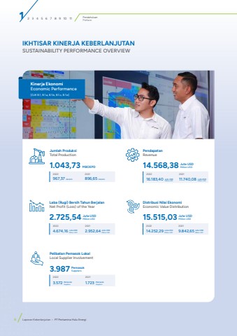 IKHTISAR KINERJA KEBERLANJUTANSUSTAINABILITY PERFORMANCE OVERVIEWJumlah ProduksiTotal Production1.043,73 MBOEPD2022 2021967,37 MBOEPD 896,65 MBOEPDPendapatanRevenue14.568,382022 202116.183,40 11.740,08Juta USDMillion USDJuta USDMillion USDJuta USDMillion USDLaba (Rugi) Bersih Tahun BerjalanNet Profit (Loss) of the Year2.725,542022 20214.674,16 2.952,64Juta USDMillion USDJuta USDMillion USDJuta USDMillion USDDistribusi Nilai EkonomiEconomic Value Distribution15.515,032022 202114.252,29 9.842,65Juta USDMillion USDJuta USDMillion USDJuta USDMillion USDPelibatan Pemasok LokalLocal Supplier Involvement3.9872022 20213.572 1.723PemasokSuppliersPemasokSuppliersPemasokSuppliersKinerja EkonomiEconomic Performance [OJK B.1, B.1.a, B.1.b, B.1.c, B.1.e]1 2 3 4 5 6 7 8 9 10 11 PendahuluanPreface6 Laporan Keberlanjutan %u2022 PT Pertamina Hulu Energi