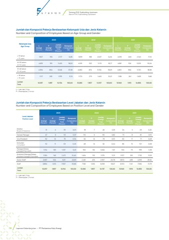 Tentang PHE Subholding UpstreamAbout PHE Subholding UpstreamJumlah dan Komposisi Pekerja Berdasarkan Kelompok Usia dan Jenis KelaminNumber and Composition of Employees Based on Age Group and GenderKelompok UsiaAge Group2023 2022 2021L(orang)(Person)P(orang)(Person)Jumlah(orang)Total(Person)KomposisiComposition(%)L(orang)(Person)P(orang)(Person)Jumlah(orang)Total(Person)KomposisiComposition(%)L(orang)(Person)P(orang)(Person)Jumlah(orang)Total(Person)KomposisiComposition(%)%u2265 51 tahun%u2265 51 years 1.927 190 2.117 14,96 1.839 188 2.027 14,34 2.293 248 2.541 17,1041-50 tahun41-50 years 4.819 591 5.410 38,22 4.591 522 5.113 36,17 4.681 524 5.205 35,0431-40 tahun31-40 years 4.394 854 5.248 37,08 4.680 874 5.554 39,29 4.801 900 5.701 38,38%u2264 30 tahun%u2264 30 years 1.117 262 1.379 9,74 1.170 273 1.443 10,21 1.168 241 1.409 9,48JumlahTotal 12.257 1.897 14.154 100,00 12.280 1.857 14.137 100,00 12.943 1.913 14.856 100,00L = Laki-laki | MaleP = Perempuan | FemaleJumlah dan Komposisi Pekerja Berdasarkan Level Jabatan dan Jenis KelaminNumber and Composition of Employees Based on Position Level and GenderLevel JabatanPosition Level2023 2022 2021L(orang)(Person)P(orang)(Person)Jumlah(orang)Total(Person)KomposisiComposition(%)L(orang)(Person)P(orang)(Person)Jumlah(orang)Total(Person)KomposisiComposition(%)L(orang)(Person)P(orang)(Person)Jumlah(orang)Total(Person)KomposisiComposition(%)DirekturBoard of Directors 31 4 35 0,25 39 7 46 0,33 24 5 29 0,20 General Manager 47 6 53 0,37 110 6 116 0,82 73 8 81 0,55 Vice President 62 14 76 0,54 64 14 78 0,55 60 11 71 0,48 KonsultanConsultant 52 11 63 0,45 48 14 62 0,44 86 15 101 0,68 Manager/SetaraManager/Equivalent 1.154 183 1.337 9,45 952 132 1.084 7,67 720 79 799 5,38 Assistant Manager/SetaraAssistant Manager/ Equivalent 1.330 142 1.472 10,40 1.424 152 1.576 11,15 1.557 165 1.722 11,59 Senior Staff 2.687 524 3.211 22,69 2.461 476 2.937 20,78 3.870 489 4.359 29,34 Staff 6.894 1.013 7.907 55,86 7.182 1.056 8.238 58,27 6.553 1.141 7.694 51,79 JumlahTotal 12.257 1.897 14.154 100,00 12.280 1.857 14.137 100,00 12.943 1.913 14.856 100,00L = Laki-laki | MaleP = Perempuan | Female56 7 8 9 10 1178 Laporan Keberlanjutan %u2022 PT Pertamina Hulu Energi