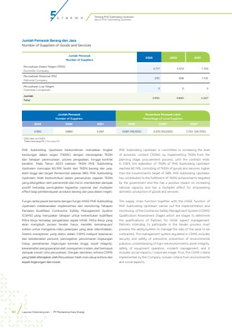 Tentang PHE Subholding UpstreamAbout PHE Subholding UpstreamJumlah Pemasok Barang dan JasaNumber of Suppliers of Goods and ServicesJumlah PemasokNumber of Suppliers 2023 2022 2021Perusahaan Dalam Negeri (PDN)Domestic Company 3.717 3.572 1.723Perusahaan Nasional (PN)National Company 270 308 1.741Perusahaan Luar Negeri Overseas Companies 3 0 3Jumlah Total3.990 3.880 3.467Jumlah PemasokNumber of SuppliersPersentase Pemasok Lokal Percentage of Local Suppliers2023 2022 2021 2023 2022* 2021*3.990 3.880 3.467 3.987 (99,92%) 3.572 (92,06%) 1.723 (49.70%)* 2021 dan/ and 2022: Tidak mencakup PN / Excludes PNPHE Subholding Upstream berkomitmen menaikkan tingkat kandungan dalam negeri (TKDN), dengan menerapkan TKDN dari tahapan perencanaan, proses pengadaan, hingga kontrak berakhir. Pada Tahun 2023 realisasi TKDN PHE Subholding Upstream mencapai 60,19% terdiri dari TKDN barang dan jasa; lebih tinggi dari target Pemerintah sebesar 58%. PHE Subholding Upstream telah berkontribusi dalam pemenuhan capaian TKDN yang ditargetkan oleh pemerintah dan hal ini memberikan dampak positif terhadap peningkatan kapasitas nasional dan multiplier effect bagi pemberdayaan produksi barang dan jasa dalam negeri.Fungsi rantai pasok bersama dengan fungsi HSSE PHE Subholding Upstream melaksanakan implementasi dan monitoring Tahapan Penilaian Kualifikasi Contractor Safety Management System(CSMS) yang merupakan tahapan untuk menentukan kualifikasi Mitra Kerja terhadap pengelolaan aspek HSSE. Mitra Kerja yang akan mengikuti proses tender harus memiliki kemampuan/sistem untuk mengelola risiko pekerjaan yang akan dikontrakkan. Sistem manajemen yang diatur dalam CSMS meliputi keamanan dan keselamatan personil, pencegahan pencemaran lingkungan hidup, pemahaman lingkungan berisiko tinggi, asset integrity, keselamatan pengoperasian alat, manajemen insiden, dan termasuk dampak sosial/ citra perusahaan. Dengan demikian, kriteria CSMS yang telah diterapkan oleh Perusahaan telah mencakup kriteria dari aspek lingkungan dan sosial. PHE Subholding Upstream is committed to increasing the level of domestic content (TKDN), by implementing TKDN from the planning stage, procurement process, until the contract ends. In 2023, the realization of TKDN of PHE Subholding Upstream reached 60.19%, consisting of TKDN of goods and services; higher than the Government's target of 58%. PHE Subholding Upstream has contributed to the fulfillment of TKDN achievements targeted by the government and this has a positive impact on increasing national capacity and has a multiplier effect for empowering domestic production of goods and services.The supply chain function together with the HSSE function of PHE Subholding Upstream carries out the implementation and monitoring of the Contractor Safety Management System (CSMS) Qualification Assessment Stages which are stages to determine the qualifications of Partners for HSSE aspect management. Partners intending to participate in the tender process must possess the ability/system to manage the risks of the work to be contracted. The management system regulated in CSMS includes security and safety of personnel, prevention of environmental pollution, understanding of high-risk environments, asset integrity, safety of equipment operation, incident management, and it includes social impacts / corporate image. Thus, the CSMS criteria implemented by the Company include criteria from environmental and social aspects. 56 7 8 9 10 1180 Laporan Keberlanjutan %u2022 PT Pertamina Hulu Energi