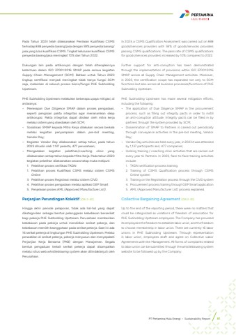 Pada Tahun 2023 telah dilaksanakan Penilaian Kualifikasi CSMS terhadap 838 penyedia barang/jasa dengan 59% penyedia barang/jasa yang lulus kualifikasi CSMS. Tingkat kelulusan kualifikasi CSMS penyedia barang/jasa meningkat 10% dari Tahun 2022. Dukungan lain pada antikorupsi dengan telah diterapkannya ketentuan dalam ISO 37001:2016 SMAP pada semua kegiatan Supply Chain Management (SCM). Bahkan untuk Tahun 2023 lingkup sertifikasi menjadi meningkat tidak hanya fungsi SCM saja, melainkan di seluruh proses bisnis/fungsi PHE Subholding Upstream.PHE Subholding Upstream melakukan beberapa upaya mitigasi, di antaranya:%u2022 Menerapan Due Diligence SMAP dalam proses pengadaan, seperti pengisian pakta integritas agar menanamkan sikap antikorupsi. Pakta integritas dapat diisikan oleh mitra kerja melalui sistem yang disediakan oleh SCM;%u2022 Sosialisasi SMAP kepada Mitra Kerja dilakukan secara berkala melalui kegiatan penyampaian dalam pre-bid meeting, Vendor Day;%u2022 Kegiatan Vendor Day dilaksanakan setiap tahun, pada tahun 2023 dihadiri oleh 1.137 peserta, 477 perusahaan;%u2022 Mengadakan kegiatan pelatihan/coaching clinic yang dilaksanakan setiap tahun kepada Mitra Kerja. Pada tahun 2023 kegiatan pelatihan dilaksanakan secara tatap muka meliputi:1. Pelatihan proses verifikasi TKDN1. Pelatihan proses Kualifikasi CSMS melalui sistem CSMS Online3. Pelatihan proses Registrasi melalui sistem CIVD4. Pelatihan proses pengadaan melalui aplikasi GEP Smart5. Penjelasan proses AML (Approved Manufacture List).Perjanjian Perundingan Kolektif [GRI 2-30]Hingga akhir periode pelaporan, tidak ada hal-hal yang dapat dikategorikan sebagai bentuk pelanggaran kebebasan berserikat bagi pekerja PHE Subholding Upstream. Perusahaan memberikan kebebasan pada pekerja untuk mendirikan serikat pekerja, dan kebebasan memilih keanggotaan pada serikat pekerja. Saat ini ada 16 serikat pekerja di lingkungan PHE Subholding Upstream. Melalui perwakilan di serikat pekerja, pekerja menyusun dan menyepakati Perjanjian Kerja Bersama (PKB) dengan Manajemen. Segala bentuk pengaduan terkait serikat pekerja dapat disampaikan melalui situs web whistleblowing system akan ditindaklanjuti oleh Perusahaan.In 2023, a CSMS Qualification Assessment was carried out on 838 goods/services providers with 59% of goods/services providers passing CSMS qualifications. The pass rate of CSMS qualifications for goods/services providers increased by 10% compared to 2022. Further support for anti-corruption has been demonstrated through the implementation of provisions within ISO 37001:2016 SMAP across all Supply Chain Management activities. Moreover, in 2023, the certification scope has expanded not only to SCM functions but also across all business processes/functions of PHE Subholding Upstream.PHE Subholding Upstream has made several mitigation efforts, including the following: %u2022 The application of Due Diligence SMAP in the procurement process, such as filling out integrity pacts in order to instill an anti-corruption attitude. Integrity pacts can be filled in by partners through the system provided by SCM;%u2022 Dissemination of SMAP to Partners is carried out periodically through conveyance activities in the pre-bid meeting, Vendor Day;%u2022 Vendor Day activities are held every year, in 2023 it was attended by 1,137 participants and, 477 companies;%u2022 Holding training / coaching clinic activities that are carried out every year to Partners. In 2023, face-to-face training activities include:1. TKDN verification process training2. Training of CSMS Qualification process through CSMS Online system3. Training on the Registration process through the CIVD system4. Procurement process training through GEP Smart application5. AML (Approved Manufacturer List) process explained.Collective Bargaining Agreement [GRI 2-30]Up to the end of the reporting period, there were no matters that could be categorized as violations of freedom of association for PHE Subholding Upstream employees. The Company has provided its employees the freedom to establish labor union, and the freedom to choose membership in labor union. There are currently 16 labor unions in PHE Subholding Upstream. Through representation in labor union, employees draft and agree on Collective Labor Agreements with the Management. All forms of complaints related to labor union can be submitted through the whistleblowing system website to be followed up by the Company.PT Pertamina Hulu Energi %u2022 Sustainability Report 81