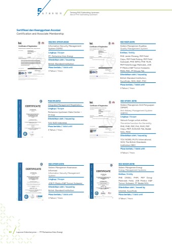 Tentang PHE Subholding UpstreamAbout PHE Subholding UpstreamSertifikasi dan Keanggotaan AsosiasiCertification and Associate MembershipISO/IEC 27001:2022Information Security Management System (ISMS)Lingkup / ScopePT. Pertamina Hulu EnergiDiterbitkan oleh / Issued byBritish Standard InstitutionMasa berlaku / Valid until3 Tahun / YearsPAS 99:2012Integrated Management RegistrationLingkup / ScopePertamina Upstream Data Center %u2013 PT PHEDiterbitkan oleh / Issued byTUV SUD IndonesiaMasa berlaku / Valid until3 Tahun / YearsISO 27001:2013Sistem Manajemen Keamanan InformasiInformation Security Management SystemLingkup / ScopeJOB P-Medco E&P Tomori SulawesiDiterbitkan oleh / Issued byBritish Standard InstitutionMasa berlaku / Valid until3 Tahun / YearsISO 37001: 2016Sistem Manajemen Anti Penyuapan (SMAP)Anti-Bribery Management System (ABMS)Lingkup / ScopeSeluruh fungsi untuk entitas The entire function for the entity PHE, PHR, PEP, PHI, PHM, PEP Cepu, PIEP, ELNUSA Tbk, Badak NGL, PDSIDiterbitkan oleh / Issued byT%u00dcV NORD, MUTU International, SGS, The British Standards Institution (BSI)Masa berlaku / Valid until3 Tahun / YearsCertificate of RegistrationINFORMATION SECURITY MANAGEMENT SYSTEM - ISO/IEC 27001:2022This is to certify that: PT Pertamina Hulu EnergiPHE Tower, 20th FloorJl. Let. Jen. TB Simatupang Kav. 99Kebagusan, Pasar Minggu,Jakarta SelatanIndonesia 12520Holds Certificate No: IS 733704and operates an Information Security Management System which complies with the requirements of ISO/IEC27001:2022 for the following scope:Information Security Management Systems (ISMS) applies to the Provision of InformationProtection, Cyber Security and Digital Defense Services in Upstream Oil and Gas BusinessActivities consisting of Perimeter Security Services, Web Security Services, Endpoint SecurityServices, Remote Working Security Services, Activity Monitoring Services and Data SecurityServices provided to Internal Users at Head Office managed by the Information TechnologySubdirectorate of PT Pertamina Hulu Energi Subholding Upstream. This is in accordance withthe Statement of Applicability No: SMKI-002/PHE53000/2023-S0 rev.0 dated 18 July 2023.Previous certificate expiries on 06/01/2024Recertification audit ended 13/12/2023For and on behalf of BSI:Emmanuel Herve, Managing Director, ASEANOriginal Registration Date: 2021-01-07 Effective Date: 2024-02-14Latest Revision Date: 2024-02-14 Expiry Date: 2027-01-06Page: 1 of 1This certificate was issued electronically and remains the property of BSI and is bound by the conditions of contract.An electronic certificate can be authenticated online.Printed copies can be validated at www.bsi-global.com/ClientDirectory or telephone +62 21 806 49 600 or +62 21 227 678 09.Further clarifications regarding the scope of this certificate and the applicability of ISO/IEC 27001:2022 requirements may be obtained by consulting theorganization.This certificate is valid only if provided original copies are in complete set.Information and Contact: BSI, Kitemark Court, Davy Avenue, Knowlhill, Milton Keynes MK5 8PP. Tel: + 44 345 080 9000BSI Assurance UK Limited, registered in England under number 7805321 at 389 Chiswick High Road, London W4 4AL, UK.Indonesia Headquarters: Talavera Office Suite 20th Floor, Suite #01-06 Jl. TB Simatupang Kav. 22 - 26, Cilandak,Jakarta Selatan , DKI Jakarta 12430, Indonesia. Tel: +62 21 2276 7809 ; +62 21 8064 9600 Fax: +62 21 2276 8271A Member of the BSI Group of Companies.Certificate of RegistrationANTI-BRIBERY MANAGEMENT SYSTEM - ISO 37001:2016This is to certify that: PT Pertamina Hulu EnergiHead OfficePHE TowerJl. TB Simatupang No.Kav. 99, RT.1/RW.1, KebagusanKec. Pasar MingguKota Jakarta SelatanDKI JakartaIndonesiaHolds Certificate No: IABMS 798587and operates an Anti-Bribery Management System which complies with the requirements of ISO 37001:2016 for thefollowing scope:The provision of upstream oil and gas exploration and production at Head OfficeFor and on behalf of BSI:Emmanuel Herve, Managing Director, ASEANOriginal Registration Date: 2024-02-12 Effective Date: 2024-02-12Latest Revision Date: 2024-02-12 Expiry Date: 2027-02-11Page: 1 of 1This certificate was issued electronically and remains the property of BSI and is bound by the conditions of contract.An electronic certificate can be authenticated online.Printed copies can be validated at www.bsi-global.com/ClientDirectory or telephone +62 21 806 49 600 or +62 21 227 678 09.Further clarifications regarding the scope of this certificate and the applicability of ISO 37001:2016 requirements may be obtained by consulting the organization.This certificate is valid only if provided original copies are in complete set.Indonesia Headquarters: Talavera Office Suite 20th Floor, Suite #01-06 Jl. TB Simatupang Kav. 22 - 26, Cilandak,Jakarta Selatan , DKI Jakarta 12430, Indonesia. Tel: +62 21 2276 7809 ; +62 21 8064 9600 Fax: +62 21 2276 8271A Member of the BSI Group of Companies.ISO 50001:2018Sistem Manajemen EnergiEnergy Management SystemsEntitas / EntityPHE ONWJ, PHM, PEP Dongi Matindok Field, JOB Medco E&P Tomori Sulawesi, PT Badak NGLDiterbitkan oleh / Issued byIntertek, SucofindoMasa berlaku / Valid until3 Tahun / YearsISO 9001:2015Sistem Manajemen KualitasQuality Management SystemEntitas / EntityPHE Jambi Merang, PEP Field Cepu, PEP Field Poleng, PEP Field Sukowati, PHE WMO, PHE TEJR, PEP Field Donggi Matindok, JOB P-Medco E&P Tomori Sulawesi, PDSI, PDC, PT Elnusa TbkDiterbitkan oleh / Issued byBritish Standard Institution, Sucofindo, SGS, AQC, PSCMasa berlaku / Valid until3 Tahun / YearsCertificate of RegistrationQUALITY MANAGEMENT SYSTEM - ISO 9001:2015This is to certify that: PT Pertamina EP Cepu Regional 4Indonesia TimurHead Office Regional 4,Patra Jasa Office TowerJalan Jend. Gatot Subroto Kav 32-34,JakartaIndonesia 12950Holds Certificate No: FS 794822and operates a Quality Management System which complies with the requirements of ISO 9001:2015 for thefollowing scope:The provision of