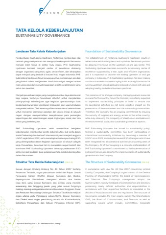 Tata Kelola KeberlanjutanSustainability GovernanceLandasan Tata Kelola KeberlanjutanPembentukan Subholding Upstream Pertamina memberikan nilai tambah yang memperkuat dan mengoptimalkan posisi Pertamina menjadi lebih fokus di sektor hulu migas. PHE Subholding Upstream berhasil menjadi center of excellence didukung dengan organisasi yang lean, agile, serta efisien, dan diharapkan dapat menjadi yang terbaik di industri hulu migas Indonesia. PHE Subholding Upstream terus berupaya untuk membangun pondasi yang kokoh dalam menjalankan bisnis hulu migas dengan aturan main yang jelas dan menyelenggarakan praktik-praktik bisnis yang sehat dan beretika.Menjadi perusahaan migas yang mengelola sumber daya alam krusial bagi negara, tentunya Perusahaan dituntut untuk menjalankan prinsip-prinsip keberlanjutan agar kegiatan operasionalnya tidak berdampak buruk bagi kelestarian lingkungan dan juga kehidupan masyarakat sekitar. Oleh karenanya Perusahaan terus berkomitmen untuk menjamin keamanan pasokan dan akses energi di seluruh negeri dengan memperhatikan kesejahteraan para pemangku kepentingan dan keseimbangan aspek lingkungan, sosial, dan tata kelola yang berkelanjutan.PHE Subholding Upstream telah menerbitkan kebijakan keberlanjutan, membentuk komite keberlanjutan, ikut serta dalam inisiatif keberlanjutan bertaraf internasional yakni menjadi anggota UNGC sejak tahun 2022, serta menetapkan beberapa strategi ESG yang diintegrasikan dalam kegiatan operasioanl di seluruh wilayah kerja Perusahaan. Kesemua hal ini merupakan wujud konkrit dari komitmen PHE Subholding Upstream terhadap pelaksanaan ESG serta menjadi landasan bagi pelaksanaan tata kelola keberlanjutan dalam Perusahaan.Struktur Tata Kelola Keberlanjutan [GRI 2-9]Sesuai dengan Undang-Undang No 40 Tahun 2007 tentang Perseroan Terbatas, organ perusahaan terdiri dari Rapat Umum Pemegang Saham (RUPS), Dewan Komisaris dan Direksi. Kepengurusan Perusahaan menganut sistem dua badan (two tier), yaitu Dewan Komisaris dan Direksi, yang memiliki wewenang dan tanggung jawab yang jelas sesuai fungsinya masing-masing sebagaimana diamanatkan dalam Anggaran Dasar dan Peraturan Perundang-Undangan. Struktur Tata Kelola meliputi organ utama yaitu Pemegang saham/RUPS, Dewan Komisaris dan Direksi serta organ pendukung antara lain Komite-komite, Sekretaris Perusahaan, dan Satuan Pengawas Internal (SPI). Foundation of Sustainability GovernanceThe establishment of Pertamina Subholding Upstream results in added value which strengthens and optimizes Pertamina%u2019s position by allowing it to focus on the upstream oil and gas sector. PHE Subholding Upstream has been successful in becoming center of excellence supported by a lean, agile, and efficient organization, and it is expected to become the leading upstream oil and gas company in Indonesia. PHE Subholding Upstream has been making continuous endeavors towards laying down a strong foundation for running upstream oil and gas business based on clearly set rules and adopting healthy and ethical business practices. The presence of oil and gas company managing natural resources is crucial for the country, hence the Company is certainly expected to implement sustainability principles in order to ensure that its operational activities do not bring negative impact on the preservation of the environment and the surrounding communities. Therefore, the Company has an ongoing commitment to ensuring the security of supplies and energy access in the entire country, while duly observing the prosperity of stakeholders and balance in the environmental, social, and sustainable governance aspects. PHE Subholding Upstream has issued its sustainability policy, formed a sustainability committee, has been participating in international sustainability initiatives by becoming a member of UNGC since 2022, and adopted several ESG strategies which have been integrated into all operational activities in all working areas of the Company. All of the foregoing is a concrete materialization of PHE Subholding Upstream's commitment to the implementation of ESG and it serves as a basis for the implementation of sustainability governance in the Company.The Structure of Sustainability Governance [GRI 2-9]In compliance with Law No. 40 Year 2007 concerning Limited Liability Companies, the Company%u2019s organs consist of the General Meeting of Shareholders (GMS), the Board of Commissioners, and Directors. The Company%u2019s management adopts the two tier system, namely the Board of Commissioners and Directors, possessing clearly defined authorities and responsibilities in accordance with their respective functions as mandated in the Articles of Association and laws and regulations. The structure of Governance includes the main organs, namely the Shareholders/GMS, the Board of Commissioners, and Directors as well as supporting organs which include, Committees, Corporate TATA KELOLA KEBERLANJUTANSUSTAINABILITY GOVERNANCE67 8 9 10 1186 Laporan Keberlanjutan %u2022 PT Pertamina Hulu Energi