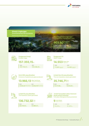 Penggunaan AirWater Usage14.5532022 202117.645 14.246Mega LiterMega LitersMega LiterMega LitersMega LiterMega LitersKinerja LingkunganEnvironmental Performance [OJK B.2, B.2.a, B.2.b, B.2.c, B.2.d]Emisi GRK yang dihasilkanEmissions of greenhouse gases produced13.966,132022 202113.916,59 10.056,78Ribu TonCO2eq Thousand TonsCO2eqRibu TonCO2eq Thousand TonCO2eqRibu TonCO2eq Thousand TonCO2eqBiaya Pengelolaan LingkunganEnvironmental Management Costs903,802022 20211.076,26 888,23Miliar USDBillion USDMiliar USDBillion USDMiliar USDBillion USDLimbah B3 yang dihasilkanThe hazardous waste generated136.732,322022 202166.478,95 Ton 40.885,51 TonLimbah Non-B3 yang dihasilkanThe non-hazardous waste generated35.746,712022 202115.411,98 Ton 19.510,94 TonJumlah fauna dalam status terancam punah yang di lestarikanCritically endangered fauna protected92022 20214 4jenis faunatypes of faunajenis faunatypes of faunajenis faunatypes of faunaPenggunaan EnergiEnergy Usage157.355,15TJ2022 2021167.742,51 TJ 123.348,45 TJTonTonsTonTonsPT Pertamina Hulu Energi %u2022 Sustainability Report 7