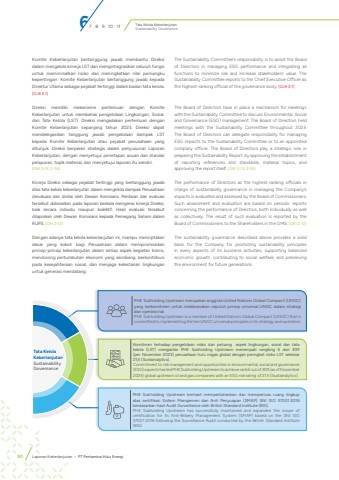 Tata Kelola KeberlanjutanSustainability GovernanceKomite Keberlanjutan bertanggung jawab membantu Direksi dalam mengelola kinerja LST dan mengintegrasikan seluruh fungsi untuk meminimalkan risiko dan meningkatkan nilai pemangku kepentingan. Komite Keberlanjutan bertanggung jawab kepada Direktur Utama sebagai pejabat tertinggi dalam badan tata kelola. [OJK E.1]Direksi memiliki mekanisme pertemuan dengan Komite Keberlanjutan untuk membahas pengelolaan Lingkungan, Sosial, dan Tata Kelola (LST). Direksi mengadakan pertemuan dengan Komite Keberlanjutan sepanjang tahun 2023. Direksi dapat mendelegasikan tanggung jawab pengelolaan dampak LST kepada Komite Keberlanjutan atau pejabat perusahaan yang ditunjuk. Direksi berperan strategis dalam penyusunan Laporan Keberlanjutan, dengan menyetujui penetapan acuan dan standar pelaporan, topik material, dan menyetujui laporan itu sendiri.[GRI 2-13, 2-14]Kinerja Direksi sebagai pejabat tertinggi yang bertanggung jawab atas tata kelola keberlanjutan dalam mengelola dampak Perusahaan dievaluasi dan dinilai oleh Dewan Komisaris. Penilaian dan evaluasi tersebut didasarkan pada laporan berkala mengenai kinerja Direksi, baik secara individu maupun kolektif. Hasil evaluasi tersebut dilaporkan oleh Dewan Komisaris kepada Pemegang Saham dalam RUPS. [GRI 2-12]Dengan adanya tata kelola keberlanjutan ini, mampu menciptakan dasar yang kokoh bagi Perusahaan dalam mempromosikan prinsip-prinsip keberlanjutan dalam setiap aspek kegiatan bisnis, mendorong pertumbuhan ekonomi yang seimbang, berkontribusi pada kesejahteraan sosial, dan menjaga kelestarian lingkungan untuk generasi mendatang.The Sustainability Committee%u2019s responsibility is to assist the Board of Directors in managing ESG performance and integrating all functions to minimize risk and increase stakeholders%u2019 value. The Sustainability Committee reports to the Chief Executive Officer as the highest-ranking official of the governance body. [OJK E.1]The Board of Directors have in place a mechanism for meetings with the Sustainability Committee to discuss Environmental, Social and Governance (ESG) management. The Board of Directors held meetings with the Sustainability Committee throughout 2023. The Board of Directors can delegate responsibility for managing ESG impacts to the Sustainability Committee or to an appointed company officer. The Board of Directors play a strategic role in preparing the Sustainability Report, by approving the establishment of reporting references and standards, material topics, and approving the report itself. [GRI 2-13, 2-14]The performance of Directors as the highest-ranking officials in charge of sustainability governance in managing the Company%u2019s impacts is evaluated and assessed by the Board of Commissioners. Such assessment and evaluation are based on periodic reports concerning the performance of Directors, both individually as well as collectively. The result of such evaluation is reported by the Board of Commissioners to the Shareholders in the GMS. [GRI 2-12]The sustainability governance described above provides a solid basis for the Company for promoting sustainability principles in every aspects of its business activities, supporting balanced economic growth, contributing to social welfare, and preserving the environment for future generations.PHE Subholding Upstream merupakan anggota United Nations Global Compact (UNGC) yang berkomitmen untuk melaksanakan sepuluh prinsip universal UNGC dalam strategi dan operasional.PHE Subholding Upstream is a member of United Nations Global Compact (UNGC) that is committed to implementing the ten UNGC universal principles in its strategy and operation.Komitmen terhadap pengelolaan risiko dan peluang aspek lingkungan, sosial dan tata kelola (LST) mengantar PHE Subholding Upstream menempati rangking 6 dari 309 (per November 2023) perusahaan hulu migas global dengan peringkat risiko LST sebesar 21,5 (Sustainalytics).Commitment to risk management and opportunities in environmental, social and governance (ESG) aspects has led PHE Subholding Upstream to achieve rank 6 out of 309 (as of November 2023) global upstream oil and gas companies with an ESG risk rating of 21.5 (Sustainalytics).PHE Subholding Upstream berhasil mempertahankan dan memperluas ruang lingkup atas sertifikasi Sistem Manajemen dan Anti Penyuapan (SMAP) SNI ISO 37001:2016 berdasarkan hasil Audit Surveillance oleh British Standard Institute (BSI).PHE Subholding Upstream has successfully maintained and expanded the scope of certification for its Anti-Bribery Management System (SMAP) based on the SNI ISO 37001:2016 following the Surveillance Audit conducted by the British Standard Institute (BSI).Tata Kelola KeberlanjutanSustainabilityGovernance67 8 9 10 1190 Laporan Keberlanjutan %u2022 PT Pertamina Hulu Energi