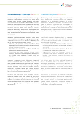 Pelibatan Pemangku Kepentingan [OJK E.4][GRI 2-29]Perusahaan menggunakan mekanisme keterlibatan pemangku kepentingan untuk melibatkan pihak-pihak yang relevan dalam mencapai tujuan bersama. Pelibatan pemangku kepentingan merupakan mekanisme akuntabilitas untuk melibatkan pemangku kepentingan dalam mengidentifikasi, memahami, dan menangani masalah terkait isu dampak ekonomi, lingkungan dan sosial. Perusahaan menyadari betul bahwa pelibatan pemangku kepentingan dalam bisnis sangat penting. Sebagai bagian dari komitmen untuk menjadi perusahaan berkelanjutan, Perusahaan selalu berusaha melibatkan pemangku kepentingan secara efektif dan berkualitas. Perusahaan mengimplementasikan beberapa prinsip dalam mekanisme pelibatan pemangku kepentingan, yang sejalan dengan AA1000 Stakeholder Engagement Standard (AA1000SES) 2015 dan ISO 26000. Prinsip-prinsip tersebut meliputi: %u2022 Inklusivitas, yaitu partisipasi pemangku kepentingan dalam memastikan tanggung jawab dan respons yang akuntabel dan strategis terhadap keberlanjutan; %u2022 Materialitas, yaitu relevansi dan signifikansi masalah bagi Perusahaan dan pemangku kepentingan; %u2022 Responsivitas, yaitu respon Perusahaan terhadap masalah pemangku kepentingan yang mempengaruhi keberlanjutan, yang dicapai melalui keputusan, tindakan, kinerja dan komunikasi.Perusahaan menggunakan AA1000 Stakeholder Engagement Standard (AA1000SES) 2015 dan ISO 26000 sebagai panduan dalam mengidentifikasi pemangku kepentingan dan melakukan interaksi dengan mereka. Hasil identifikasi pemangku kepentingan kemudian digunakan untuk melakukan pelibatan pemangku kepentingan, memetakan hal-hal yang menjadi perhatian pemangku kepentingan, dan merumuskan program berdasarkan kebutuhan dan harapan pemangku kepentingan.Perusahaan telah melaksanakan proses identifikasi pemangku kepentingan melalui analisis pola interaksi dan keterlibatan dengan kegiatan operasi maupun perusahaan. PHE Subholding Upstream mengidentifikasi 10 pemangku kepentingan yang saling mempengaruhi dalam proses bisnis. Perusahaan selalu melibatkan setiap pemangku kepentingan melalui kegiatan komunikasi rutin dan metode lain. Stakeholder Engagement [OJK E.4][GRI 2-29]The Company uses the stakeholder engagement mechanism to involve relevant parties in achieving common goals. Stakeholder engagement is an accountability mechanism for involving stakeholders in identifying, understanding, and addressing issues related to economic, environmental, and social impact. The Company is truly aware of the great importance of engaging stakeholders in its business. As part of its commitment to becoming a sustainable Company, it always strives to involve its stakeholders in an effective and high-quality manner. The Company implements several principles in the stakeholder engagement mechanism, in line with AA1000 Stakeholder Engagement Standard (AA1000SES) 2015 and ISO 26000. Such principles include the following: %u2022 Inclusiveness, namely stakeholders%u2019 participation in ensuring responsibility and accountable as well as strategic response to sustainability; %u2022 Materiality, namely relevance and significance of the issue concerned to the Company and its stakeholders; %u2022 Responsiveness, namely the Company%u2019s response to stakeholders%u2019 issues affecting sustainability, which can be achieved through decisions, measures, performance and communication.The Company applies the AA1000 Stakeholder Engagement Standard (AA1000SES) 2015 and ISO 26000 as guidance in the identification of stakeholders and in interacting with them. The results of stakeholder identification are subsequently used in the engagement of stakeholders, in mapping their points of interest, and in formulating programs based on stakeholders%u2019 needs and expectations.The Company has implemented the stakeholder identification process through the analysis of patterns of their interaction with and involvement in the operational activities and the Company. PHE Subholding Upstream has identified 10 stakeholders that mutually influence one another in the business process. The Company constantly engages each stakeholder through routine communication activities and other methods.PT Pertamina Hulu Energi %u2022 Sustainability Report 91