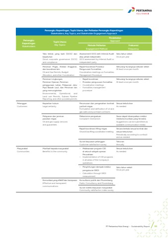 Pemangku Kepentingan, Topik Utama, dan Pelibatan Pemangku KepentinganStakeholders, Key Topics, and Stakeholder Engagement Approach Pemangku KepentinganStakeholdersTopik UtamaKey TopicsPendekatanApproachMetode PelibatanEngagement MethodFrekuensiFrequencyTata kelola yang baik (GCG) dan kepatuhanGood corporate governance (GCG) and complianceAssessment GCG oleh Internal Audit atau pihak independenGCG assessment by Internal Audit or independent partySatu tahun sekaliOnce per yearPerizinan Migas, Alokasi Anggaran, dan koordinasi lainOil and Gas Permits, BudgetAllocation, and other CoordinationRapat Koordinasi Prosedur Pengurusan FormalitiesCoordination meetings on Formalities Management ProcedureSekurang-kurangnya sebulan sekaliAt least once per monthPerizinan Lingkungan,Perizinan Operasi, Perizinanpenggunaan Lahan, Pelaporan Jalur Pipa Bawah Laut, dan Perizinan lain yang memungkinkanEnvironmental, Operational, and Land use Permits, Subsea Pipeline Reporting, and other possible permits%u2022 Rapat koordinasi%u2022 Prosedur pengurusan formalitas%u2022 Coordination meetings%u2022 Formalities management procedureSekurang-kurangnya sebulan sekaliAt least once per monthPelangganCustomersKepastian hukumLegal certaintyPerumusan dan pengesahan kontrak jual beli migasFormulation and ratification of oil and gas sales and purchase contractsSesuai kebutuhanAs neededPelayanan dan jaminanpasokan migasOil and gas supply servicesand guaranteesMekanisme pengaduanComplaint mechanismSaran dapat disampaikan melalui media komunikasi yang tersediaSuggestions can be submitted via available communication mediaRapat koordinasi lifting migasOil and Gas lifting coordination meetingSecara berkala sesuai kontrak dan sesuai kebutuhanPeriodically according to contract and as neededSurvei kepuasan pelangganCustomer satisfaction surveyTahunanAnnuallyMasyarakatCommunitiesManfaat kepada masyarakatBenefits to the community%u2022 Pelaksanaan program CID di seluruh wilayah operasi Perusahaan%u2022 Implementation of CID programs in all areas of the Company%u2019s operationsSesuai kebutuhanAs needed%u2022 Penghitungan dampak melalui pengukuran SROI%u2022 Calculation through SROI measurementSatu tahun sekaliOnce per yearKomunikasi yang efektif dan transparanEffective and transparent communicationsKonsultansi publik dan MusrenbangPublic Consultancy and MusrenbangSurvei indeks kepuasan masyarakatCommunity satisfaction index surveyPT Pertamina Hulu Energi %u2022 Sustainability Report 93