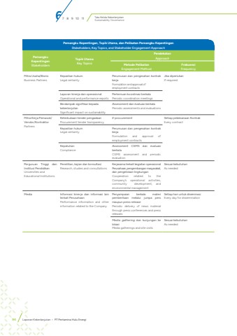 Tata Kelola KeberlanjutanSustainability GovernancePemangku Kepentingan, Topik Utama, dan Pelibatan Pemangku KepentinganStakeholders, Key Topics, and Stakeholder Engagement Approach Pemangku KepentinganStakeholdersTopik UtamaKey TopicsPendekatanApproachMetode PelibatanEngagement MethodFrekuensiFrequencyMitra Usaha/BisnisBusiness PartnersKepastian hukumLegal certaintyPerumusan dan pengesahan kontrak kerjaFormulation and approval of employment contractsJika diperlukanIf requiredLaporan kinerja dan operasionalOperational and performance reportsPertemuan koordinasi berkalaPeriodic coordination meetingsBerdampak signifikan kepada keberlanjutanSignificant impact on sustainabilityAssessment dan evaluasi berkalaPeriodic assessments and evaluationsMitra Kerja Pemasok/Vendor/KontraktorPartnersKeterbukaan tender pengadaanProcurement tender transparencyE-procurement Setiap pelaksanaan KontrakEvery contractKepastian hukumLegal certaintyPerumusan dan pengesahan kontrak kerjaFormulation and approval of employment contractsKepatuhanComplianceAssessment CSMS dan evaluasi berkalaCSMS assessment and periodic evaluationPerguruan Tinggi dan Institusi PendidikanUniversities andEducational InstitutionsPenelitian, kajian dan konsultasiResearch, studies and consultationsKerjasama terkait kegiatan operasional Perusahaan, pengembangan masyarakat, dan pengelolaan lingkunganCooperation related to the Company%u2019s operational activities, community development, and environmental managementSesuai kebutuhanAs neededMedia Informasi kinerja dan informasi lain terkait PerusahaanPerformance information and other information related to the CompanyPenyampaian berkala materi pemberitaan melalui jumpa pers maupun press releasePeriodic delivery of news material through press conferences and press releases Setiap hari untuk diseminasiEvery day for disseminationMedia gathering dan kunjungan ke lokasi Media gatherings and site visitsSesuai kebutuhanAs needed67 8 9 10 1194 Laporan Keberlanjutan %u2022 PT Pertamina Hulu Energi