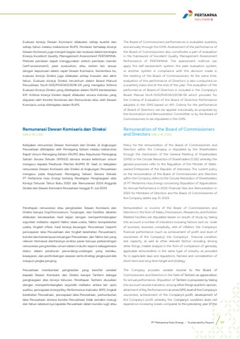 Evaluasi kinerja Dewan Komisaris dilakukan setiap kuartal dan setiap tahun melalui mekanisme RUPS. Penilaian terhadap kinerja Dewan Komisaris juga menjadi bagian dari evaluasi dalam kerangka Kinerja Excellent Quality Management Assessment PERTAMINA. Metode penilaian dapat menggunakan sistem penilaian mandiri (self-assessment), peer evaluation, atau sistem lain sesuai dengan keputusan dalam rapat Dewan Komisaris. Sementara itu, evaluasi kinerja Direksi juga dilakukan setiap triwulan dan akhir tahun. Evaluasi kinerja Direksi tercantum dalam Board Manual Perusahaan No.A-005/PHE040/2018-S9 yang mengatur Kriteria Evaluasi Kinerja Direksi yang ditetapkan dalam RUPS berdasarkan KPI. Kriteria kinerja Direksi dapat dilakukan secara individu yang diajukan oleh Komite Nominasi dan Remunerasi atau oleh Dewan Komisaris untuk ditetapkan dalam RUPS.Remunerasi Dewan Komisaris dan Direksi [GRI 2-19, 2-20]Kebijakan remunerasi Dewan Komisaris dan Direksi di lingkungan Perusahaan ditetapkan oleh Pemegang Saham melalui mekanisme Rapat Umum Pemegang Saham (RUPS) atau Keputusan Pemegang Saham Secara Sirkuler (KPSSS) dimana secara ketentuan umum mengacu kepada Peraturan Menteri BUMN RI. Saat ini kebijakan remunerasi Dewan Komisaris dan Direksi di lingkungan Perusahaan mengacu pada Keputusan Pemegang Saham Secara Sirkuler PT Pertamina Hulu Energi tentang Penetapan Penghargaan atas Kinerja Tahunan Tahun Buku 2022 dan Remunerasi 2023 Anggota Direksi dan Dewan Komisaris Perusahaan tanggal 31 Juli 2023. Penetapan remunerasi atau penghasilan Dewan Komisaris dan Direksi berupa Gaji/Honorarium, Tunjangan, dan Fasilitas Jabatan dilakukan berdasarkan hasil kajian dengan mempertimbangkan sejumlah indikator seperti faktor skala usaha, faktor kompleksitas usaha, tingkat inflasi, hasil kinerja keuangan Perusahaan (seperti pencapaian laba Perusahaan dan tingkat kesehatan Perusahaan), kondisi dan kemampuan keuangan Perusahaan, dan faktor lain yang relevan termasuk diantaranya analisa pasar berupa perbandingan remunerasi yang berlaku umum dalam industri sejenis sebagaimana diatur dalam peraturan perundang-undangan yang berlaku, kewajaran, dan pertimbangan sasaran serta strategi jangka pendek maupun jangka panjang.Perusahaan memberikan penghasilan yang bersifat variabel kepada Dewan Komisaris dan Direksi berupa Tantiem sebagai penghargaan atas kinerja tahunan. Penetapan Tantiem diusulkan dengan mempertimbangkan sejumlah indikator antara lain opini auditor, pencapaian kinerja/Key Performance Indicator (KPI), tingkat kesehatan Perusahaan, pencapaian laba Perusahaan, pertumbuhan laba Perusahaan dimana kondisi Perusahaan tidak semakin merugi dari tahun sebelumnya (apabila Perusahaan dalam kondisi rugi) atau The Board of Commissioners performances is evaluated quarterly and annually through the GMS. Assessment of the performance of the Board of Commissioners also constitutes a part of evaluation in the framework of Excellent Quality Management Assessment Performance of PERTAMINA. The assessment method can apply the self-assessment system, the peer evaluation system, or another system in compliance with the decision made in the meeting of the Board of Commissioners. At the same time, evaluation of the performance of Directors is also conducted on a quarterly basis and at the end of the year. The evaluation of the performance of Board of Directors is included in the Company%u2019s Board Manual No.A-005/PHE040/2018-S9 which provides for the Criteria of Evaluation of the Board of Directors Performance adopted in the GMS based on KPI. Criteria for the performance of Board of Directors can be applied individually as proposed by the Nomination and Remuneration Committee or by the Board of Commissioners to be stipulated in the GMS.Remuneration of the Board of Commissioners and Directors [GRI 2-19, 2-20]Policy for the remuneration of the Board of Commissioners and Directors within the Company is stipulated by the Shareholders through the mechanism of the General Meeting of Shareholders (GMS) or the Circular Resolution of Shareholders (CSD) whereby the general provisions refer to the Regulation of the Minister of Stateowned Enterprises of the Republic of Indonesia. The current policy on the remuneration of the Board of Commissioners and Directors within the Company refers to the Circular Resolution of Shareholders of PT Pertamina Hulu Energi concerning Stipulation of Appreciation for Annual Performance in 2022 Financial Year and Remuneration in 2023 for Members of Directors and the Board of Commissioners of the Company dated July 31, 2023. Remuneration or income of the Board of Commissioners and Directors in the form of Salary /Honorarium, Allowances, and Position Related Facilities are stipulated based on results of study by taking into account a number of indicators including factors such as scale of business, business complexity, rate of inflation, the Company%u2019s financial performance (such as achievement of profit and level of soundness of the Company), the Company%u2019s financial condition and capacity, as well as other relevant factors including, among other things, market analysis in the form of comparison of generally applicable remuneration in the same type of industry as provided for in applicable laws and regulations, fairness and consideration of short-term and long-term target and strategy.The Company provides variable income to the Board of Commissioners and Directors in the form of Tantiem as appreciation for annual performance. Stipulation of Tantiem is proposed by taking into account several indicators, among other things auditor%u2019s opinion, attainment of Key Performance Indicators (KPI), level of the Company%u2019s soundness, achievement of the Company%u2019s profit, development of the Company%u2019s profit whereby the Company%u2019s condition does not experience increasing losses compared to the preceding year (if the PT Pertamina Hulu Energi %u2022 Sustainability Report 97