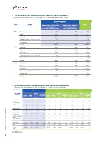 Level JabatanJob Level2024 2023 2022L(orang)(person)P(orang)(person)Jumlah(orang)Total(person)KomposisiComposition(%)L(orang)(person)P(orang)(person)Jumlah(orang)Total(person)KomposisiComposition(%)L(orang)(person)P(orang)(person)Jumlah(orang)Total(person)KomposisiComposition(%)KomisarisBoard of Commissioners33 1 34 0 31 1 32 0 30 3 33 0DirekturBoard of Directors 28 3 31 0 27 4 31 0 25 5 30 0General Manager 56 7 63 0 60 5 65 0 76 4 80 0,01Vice President 75 15 90 0,01 67 14 81 0,01 70 14 84 0,01Manager/SetaraManager/Equal 757 111 868 0,06 816 109 925 0,07 776 99 875 0,06Assistant Manager/SetaraAssistant Manager/ Equal1.013 145 1.158 0,08 987 132 1.119 0,08 971 132 1.103 0,08Senior Staff 2.189 409 2.598 0,19 1.849 338 2.187 0,15 1.742 291 2.033 0,14Staff 7.957 1.209 9.166 0,65 8.398 1.288 9.686 0,69 8.581 1.306 9.887 0,7JumlahTotal 12.108 1.900 14.008 1 12.235 1.891 14.126 1 12.271 1.854 14.125 1L = Laki-laki | MaleP = Perempuan | FemaleJumlah dan Komposisi Pekerja Berdasarkan Level Jabatan dan Jenis KelaminNumber and Composition of Workers Based on Position Level and GenderJumlah dan Komposisi Pekerja Berdasarkan Lokasi dan Status KepegawaianNumber and Composition of Employees by Location and Employment StatusTahunYearLokasiLocationStatus KepegawaianEmployment StatusJumlahPekerja Waktu Tidak Tertentu Total(PKWTT) (Tetap)Unspecified Time EmploymentPekerja Waktu Tertentu (PKWT) (Kontrak)Fixed Time Employment2024 Sumatra 3.171 244 3.415Jawa 6.563 914 7.477Kalimantan 2.187 34 2.851Indonesia Timur | Eastern Indonesia 210 5 215Internasional 49 1 50Jumlah 12.180 1.198 14.0082023 Sumatra 3.301 246 3.547Jawa 6.589 888 7.477Kalimantan 2.689 28 2.717Indonesia Timur | Eastern Indonesia 210 4 214Internasional 45 2 47Jumlah 12.961 1.165 14.1262022 Sumatra 3.447 245 3.692Jawa 6.279 835 7115Kalimantan 3.033 19 3.052Indonesia Timur | Eastern Indonesia 217 5 222Internasional 42 2 44Jumlah 13.018 1.107 14.125HULU ENERGILaporan Keberlanjutan %u2022 Sustainability Report 98