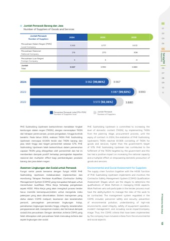 Jumlah Pemasok Barang dan JasaNumber of Suppliers of Goods and ServicesJumlah PemasokNumber of Suppliers 2024 2023 2022Perusahaan Dalam Negeri (PDN)Local Company 3.346 3.717 3.572Perusahaan NasionalNational Company 216 270 308Perusahaan Luar NegeriForeign Company 5 3 0JumlahTotal 3.567 3.990 3.880PHE Subholding Upstream berkomitmen menaikkan tingkat kandungan dalam negeri (TKDN), dengan menerapkan TKDN dari tahapan perencanaan, proses pengadaan, hingga kontrak berakhir. Pada tahun 2024, realisasi TKDN PHE Subholding Upstream mencapai 61,06% terdiri dari TKDN barang dan jasa; lebih tinggi dari target pemerintah sebesar 57%. PHE Subholding Upstream telah berkontribusi dalam pemenuhan capaian TKDN yang ditargetkan oleh pemerintah dan hal ini memberikan dampak positif terhadap peningkatan kapasitas nasional dan multiplier effect bagi pemberdayaan produksi barang dan jasa dalam negeri.Asesmen Lingkungan dan Sosial untuk PemasokFungsi rantai pasok bersama dengan fungsi HSSE PHE Subholding Upstream melaksanakan implementasi dan monitoring Tahapan Penilaian Kualifikasi Contractor Safety Management System (CSMS) yang merupakan tahapan untuk menentukan kualifikasi Mitra Kerja terhadap pengelolaan aspek HSSE. Mitra Kerja yang akan mengikuti proses tender harus memiliki kemampuan/sistem untuk mengelola risiko pekerjaan yang akan dikontrakkan. Sistem manajemen yang diatur dalam CSMS meliputi; keamanan dan keselamatan personil, pencegahan pencemaran lingkungan hidup, pemahaman lingkungan berisiko tinggi, integrity, keselamatan pengoperasian alat, manajemen insiden, dan termasuk dampak sosial/citra perusahaan. Dengan demikian, kriteria CSMS yang telah diterapkan oleh perusahaan telah mencakup kriteria dari aspek lingkungan dan sosial.PHE Subholding Upstream is committed to increasing the level of domestic content (TKDN), by implementing TKDN from the planning stage, procurement process, until the expiry of contract. In 2024, the realization of PHE Subholding Upstream%u2019s TKDN reached 61.06% consisting of TKDN for goods and services; higher than the government%u2019s target of 57%. PHE Subholding Upstream has contributed to the fulfillment of the TKDN targeted by the government and this has had a positive impact on increasing the national capacity and a multiplier effect on empowering domestic production of goods and services.Environmental and Social Assessment for SuppliersThe supply chain function together with the HSSE function of PHE Subholding Upstream implements and monitors the Contractor Safety Management System (CSMS) Qualification Assessment Stages which are the stages to determine the qualifications of Work Partners in managing HSSE aspects. Work Partners who will participate in the tender process must have the ability/system to manage the risks of the work to be contracted. The management system regulated in the CSMS includes; personnel safety and security, prevention of environmental pollution, understanding of high-risk environments, asset integrity, safety of equipment operation, incident management, and including social impact/company image. Thus, the CSMS criteria that have been implemented by the company have included criteria from the environmental and social aspects.2024202320223.5673.9903.8803.562 (99,86%)3.987 (99,92%)3.572 (92,06%)Jumlah PemasokNumber of SuppliersPersentasi Pemasok Lokal (PN+PDN)Number of Suppliers local0102030405 About PHE Tentang PHE060708091011 PT Pertamina Hulu Energi 101
