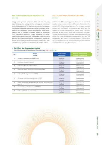 No. NamaNameKeanggotaanMembershipNasional / InternasionalNational / International1 Society of Petroleum Engineers (SPE) AnggotaMemberInternasionalInternational2 UN Global Compact (UNGC) AnggotaMemberInternasionalInternational3 Indonesian Petroleum Assosiation AnggotaMemberInternasionalInternational4 Ikatan Ahli Teknik Perminyakan Indonesia (IATMI) AnggotaMemberInternasionalInternational5 Ikatan Ahli Geologi Indonesia (IAGI) AnggotaMemberInternasionalInternational6 Himpunan Ahli Geofisika Indonesia (HAGI) AnggotaMemberInternasionalInternational7 Ikatan Ahli Fasilitas Produksi Minyak dan Gas Bumi Indonesia (IAFMI) AnggotaMemberInternasionalInternational8 Asosiasi Pengusaha Indonesia (APINDO) AnggotaMemberInternasionalInternational9 Indonesia Petroleum Association AnggotaMemberInternasionalInternationalPERJANJIAN PERUNDINGAN KOLEKTIF [GRI 2-30]Hingga akhir periode pelaporan, tidak ada hal-hal yang dapat dikategorikan sebagai bentuk pelanggaran kebebasan berserikat bagi pekerja PHE Subholding Upstream. Perusahaan memberikan kebebasan pada pekerja untuk mendirikan serikat pekerja, dan kebebasan memilih keanggotaan pada serikat pekerja. Saat ini, terdapat 16 serikat pekerja di lingkungan PHE Subholding Upstream. Melalui perwakilan di serikat pekerja, pekerja menyusun dan menyepakati Perjanjian Kerja Bersama (PKB) dengan Manajemen. Segala bentuk pengaduan terkait serikat pekerja dapat disampaikan melalui situs webwhistleblowing system akan ditindaklanjuti oleh Perusahaan.COLLECTIVE BARGAINING AGREEMENT [GRI 2-30]Until the end of the reporting period, there were no cases that could be categorized as violations of freedom of association for workers of PHE Subholding Upstream. The company provides workers with the freedom to establish a labor union, and the freedom to choose membership of a labor union. Currently, there are 16 labor unions within PHE Subholding Upstream. Through representatives in the labor unions, workers draft and agree to a Collective Bargaining Agreement (CBA) with the Management. Any form of complaint related to a labor union can be submitted through the whistleblowing system website and will be followed up by the Company.Sertifikasi dan Keanggotaan AsosiasiCertifications and Association Memberships [OJK C.5][GRI 2-28]0102030405 About PHE Tentang PHE060708091011 PT Pertamina Hulu Energi 103