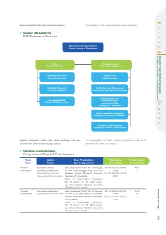Berikut adalah struktur tata Kelola Perusahaan: The following is the Corporate Governance structure:Struktur Tata Kelola PHEPHE Governance StructureAdapun komposisi badan tata kelola tertinggi PHE per 31 Desember 2024 adalah sebagai berikut:The composition of PHE's highest governance body as of December 31, 2024 is as follows:NamaNameJabatanPositionDasar PengangkatanBasis for AppointmentMasa JabatanTerm of OfficePeriode JabatanPeriod of OfficeRindaldi FirmansyahKomisaris Utama/Komisaris IndependenPresident Comissioner/Independent CommissionerAkta Keputusan RUPS No. 79 tanggal 15 Mei 2023 tanggal yang dibuat di hadapan Notaris Marianne Vincentia Hamdani, SH di Jakarta.Deed of Shareholders%u2019 Resolution No. 79 dated May 15, 2023, drawn up before Notary Marianne Vincentia Hamdani, SH, in Jakarta.15 Mei 2023 s.d 15 Mei 2026May 15, 2023 to May 15, 2026Ke-22ndTumpak SimanjuntakKomisaris IndependenIndependent CommissionerAkta Keputusan RUPS No. 79 tanggal 15 Mei 2023 yang dibuat di hadapan Notaris Marianne Vincentia Hamdani, SH di Jakarta.Deed of Shareholders%u2019 Resolution No. 79 dated May 15, 2023, drawn up before Notary Marianne Vincentia Hamdani, SH, in Jakarta.15 Mei 2023 s.d 15 Mei 2026May 15, 2023 to May 15, 2026Ke-22ndKomposisi Dewan KomisarisComposition of Board of CommissionersDewan KomisarisBoard of CommissionersKomite Tata Kelola TerintegrasiIntegrated Governance CommitteeKomite Investasi dan Manajemen RisikoInvestment and Risk Management CommitteeDireksiBoard of DirectorsSekretaris PerusahaanCorporate SecretaryChief Audit ExecutiveChief Audit ExecutiveKomite Etik & GCGEthic and GCG CommitteeRapat Umum Pemegang SahamGeneral Meeting of ShareholdersKomite AuditAudit CommitteeKomite Nominasi & RemunerasiNomination & Remuneration CommitteeSekretaris Dewan KomisarisSecretary of Board of Commissioners010203040506 Strengthening Foundation of Sustainable Governance Penguatan Fondasi Tata Kelola Keberlanjutan0708091011 PT Pertamina Hulu Energi 109