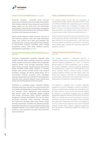 RASIO TOTAL KOMPENSASI [GRI 2-21, 405-2]Perusahaan senantiasa memastikan bahwa komposisi kompensasi yang diberikan ideal untuk setiap jenjang jabatan. Tidak terdapat perbedaan antara kompensasi yang diberikan kepada pekerja pria dan wanita diluar dari pertimbangan jenjang jabatan, masa kerja, dan kinerja pekerja, sehingga rasio total kompensasi antara pekerja pria dan wanita pada jabatan, masa kerja, dan kinerja yang sama adalah 1:1. Selama periode pelaporan, tingkat remunerasi entry level di PHE Subholding Upstream masih lebih tinggi dibandingkan dengan upah minimum tahun 2024 yang ditetapkan oleh pemerintah daerah di masing-masing Wilayah Kerja. Kebijakan ini mencerminkan komitmen perusahaan dalam menjaga kesejahteraan pekerja sambil tetap mematuhi peraturan ketenagakerjaan yang berlaku. [GRI 202-1]PELIBATAN PEMANGKU KEPENTINGAN [OJK E.4] [GRI 2-29]Perusahaan mengedepankan pendekatan kolaboratif dalam menjalin hubungan dengan pemangku kepentingan, termasuk melalui perjanjian kerja bersama sebagai bentuk pengambilan keputusan kolektif. Untuk pemangku kepentingan internal, seperti pekerja, perusahaan menjalin perjanjian kerja bersama dengan perwakilan serikat pekerja. Perjanjian ini mencakup berbagai aspek penting, termasuk kondisi kerja, peraturan perusahaan, tunjangan, dan hak-hak pekerja lainnya. Hal ini mencerminkan komitmen perusahaan untuk menciptakan hubungan yang transparan dan partisipatif, di mana pengambilan keputusan terkait operasional dilakukan secara bersama-sama dengan mempertimbangkan kebutuhan semua pihak.Pendekatan ini terintegrasi dengan mekanisme pelibatan pemangku kepentingan yang lebih luas, yang dirancang untuk menciptakan akuntabilitas dalam mengidentifikasi, memahami, dan menangani isu-isu keberlanjutan yang berdampak pada ekonomi, sosial, dan lingkungan. Dengan mengacu pada standar internasional seperti AA1000 Stakeholder Engagement Standard (AA1000SES) 2015 dan ISO 26000, perusahaan memastikan prinsip inklusivitas, materialitas, dan responsivitas diterapkan dalam setiap interaksi dengan pemangku kepentingan. Identifikasi dan pelibatan pemangku kepentingan tidak hanya mencakup pihak eksternal tetapi juga melibatkan karyawan secara internal melalui perjanjian kerja bersama ini, yang memperkuat hubungan antara perusahaan dan tenaga kerjanya.TOTAL COMPENSATION RATIO [GRI 2-21, 405-2]The company always ensures that the composition of compensation provided is ideal for each level of position. There is no difference between the compensation given to male and female workers beyond the consideration of position level, length of service, and employee performance, therefore, the total compensation ratio between male and female workers in the same position, length of service, and performance is 1:1. During the reporting period, the entry-level remuneration level at PHE Subholding Upstream was still higher than the minimum wage 2024 set by the local government in each Work Area. This policy reflects the company's commitment to maintaining worker welfare while complying with applicable employment regulations. [GRI 202-1]STAKEHOLDER ENGAGEMENT [OJK E.4][GRI 2-29]The company prioritizes a collaborative approach in establishing relationships with stakeholders, including through collective bargaining agreements as a form of collective decision-making. For internal stakeholders, such as workers, the company establishes collective bargaining agreements with representatives of a labor union. These agreements cover various important aspects, including working conditions, company regulations, benefits, and other workers' rights. This reflects the company's commitment to creating transparent and participatory relationships, where operational decisions are made jointly by considering the needs of all parties.This approach is integrated with a broader stakeholder engagement mechanism, designed to create accountability in identifying, understanding, and addressing sustainability issues that have economic, social, and the environmental impacts. By referring to international standards such as AA1000 Stakeholder Engagement Standard (AA1000SES) 2015 and ISO 26000, the company ensures that the principles of inclusivity, materiality, and responsiveness are applied in every interaction with stakeholders. Stakeholder identification and engagement not only includes external parties but also involves employees internally through these collective bargaining agreements, which strengthen the relationship between the company and its workforce.HULU ENERGILaporan Keberlanjutan %u2022 Sustainability Report 120