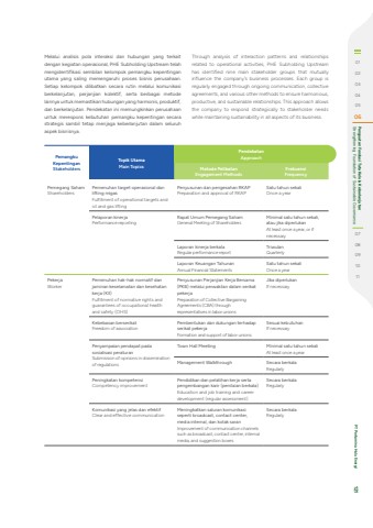 Melalui analisis pola interaksi dan hubungan yang terkait dengan kegiatan operasional, PHE Subholding Upstream telah mengidentifikasi sembilan kelompok pemangku kepentingan utama yang saling memengaruhi proses bisnis perusahaan. Setiap kelompok dilibatkan secara rutin melalui komunikasi berkelanjutan, perjanjian kolektif, serta berbagai metode lainnya untuk memastikan hubungan yang harmonis, produktif, dan berkelanjutan. Pendekatan ini memungkinkan perusahaan untuk merespons kebutuhan pemangku kepentingan secara strategis sambil tetap menjaga keberlanjutan dalam seluruh aspek bisnisnya.Through analysis of interaction patterns and relationships related to operational activities, PHE Subholding Upstream has identified nine main stakeholder groups that mutually influence the company's business processes. Each group is regularly engaged through ongoing communication, collective agreements, and various other methods to ensure harmonious, productive, and sustainable relationships. This approach allows the company to respond strategically to stakeholder needs while maintaining sustainability in all aspects of its business.Pemangku KepentinganStakeholdersTopik UtamaMain TopicsPendekatanApproachMetode PelibatanEngagement MethodsFrekuensiFrequencyPemegang SahamShareholdersPemenuhan target operasional dan lifting migasFulfillment of operational targets and oil and gas liftingPenyusunan dan pengesahan RKAPPreparation and approval of RKAPSatu tahun sekaliOnce a yearPelaporan kinerjaPerformance reportingRapat Umum Pemegang SahamGeneral Meeting of ShareholdersMinimal satu tahun sekali, atau jika diperlukanAt least once a year, or if necessaryLaporan kinerja berkalaRegular performance reportTriwulanQuarterlyLaporan Keuangan TahunanAnnual Financial StatementsSatu tahun sekaliOnce a yearPekerjaWorkerPemenuhan hak-hak normatif dan jaminan keselamatan dan kesehatan kerja (K3)Fulfillment of normative rights and guarantees of occupational health and safety (OHS)Penyusunan Perjanjian Kerja Bersama (PKB) melalui perwakilan dalam serikat pekerjaPreparation of Collective Bargaining Agreements (CBA) through representatives in labor unionsJika diperlukanIf necessaryKebebasan berserikatFreedom of associationPembentukan dan dukungan terhadap serikat pekerjaFormation and support of labor unionsSesuai kebutuhanIf necessaryPenyampaian pendapat pada sosialisasi peraturanSubmission of opinions in dissemination of regulationsTown Hall Meeting Minimal satu tahun sekaliAt least once a yearManagement Walkthrough Secara berkalaRegularlyPeningkatan kompetensiCompetency improvementPendidikan dan pelatihan kerja serta pengembangan karir (penilaian berkala)Education and job training and career development (regular assessment)Secara berkalaRegularlyKomunikasi yang jelas dan efektifClear and effective communicationMeningkatkan saluran komunikasi seperti broadcast, contact center, media internal, dan kotak saranImprovement of communication channels such as broadcast, contact center, internal media, and suggestion boxesSecara berkalaRegularly010203040506 Strengthening Foundation of Sustainable Governance Penguatan Fondasi Tata Kelola Keberlanjutan0708091011 PT Pertamina Hulu Energi 121
