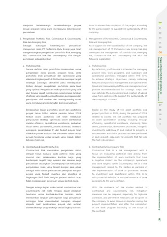 menjamin terlaksananya terselesaikannya proyek sesuai program kerja guna mendukung keberlanjutan perusahaan.2. Pengelolaan Portfolio Risk, Contractual & Counterparty Risk dan Emerging RiskSebagai dukungan keberlanjutan perusahaan manajemen risiko PT Pertamina Hulu Energi juga telah mengembangkan pengelolaan portofolio Risk, emerging risk, contractual risk dan counterparty risk dengan penjelasan sebagai berikut:a. Portofolio RiskSecara definisi risiko portofolio dimaksudkan untuk pengelolaan risiko proyek, program kerja, serta portofolio anak perusahaan dan operasional yang dikelola di lingkungan PHE SHU untuk mencapai target strategis (strategic obective) yaitu mendapatkan Return dengan pengelolaan portofolio pada level yang optimal. Pengelolaan resiko portofolio yang baik dan terukur dapat memberikan rekomendasi langkah strategis yang dapat mengoptimalkan pencapaian dan penciptaan nilai tambah dari masing-masing assetguna mendukung keberlanjutan bisnis perusahaan.Berdasarkan kajian portofolio asset dan portofolio proyek tahun 2024, selama periode tahun 2024 terkait asset, portofolio risk telah melakukan penyusunan strategi optimisasi asset diantaranya melalui efisiensi, operational excellence, perbaikan fiscal terms, partnership, proses divestasi, investasi anorganik, penambahan PI dan terkait proyek telah dilakukan proses evaluasi risk treatment dalam setiap proyek terutama untuk proyek yang masuk dalam kategori high risk.b. Contractual & Counterparty RiskContractual Risk merupakan pengelolaan risiko dengan fokus evaluasi pada potensi risiko yang muncul dari pelaksanaan kontrak kerja yang berdampak negatif bagi operasi dan sasaran kerja perusahaan sedangkan Counterparty risk merupakan pengelolaan risiko yang terkait dengan para pihak sebagai mitra dalam pelaksanaan pekerjaan maupun proses yang terkait investasi dan divestasi di lingkungan PHE SHU dengan potensi default atau tidak melaksanakan pekerjaan sesuai kontrak kerja.Dengan adanya kajian risiko terkait contractual dan counterparty risk maka mitigasi dapat disiapkan terutama untuk kontrak-kontrak berisiko serta memberikan langkah pencegahan bagi perusahaan sehingga tidak menimbulkan kerugian ataupun dispute saat pelaksanaan proyek dan setelah diselesaikannya program kerja sesuai lingkup kontrak.so as to ensure the completion of the project according to the work program to support the sustainability of the company.2. Management of Portfolio Risk, Contractual & Counterparty Risk and Emerging Risk As a support for the sustainability of the company, the risk management of PT Pertamina Hulu Energi has also developed the management of portfolio risk, emerging risk, contractual risk and counterparty risk with the following explanation:a. Portofolio RiskBy definition, portfolio risk is intended for managing project risks, work programs, and subsidiary and operational portfolios managed within PHE SHU to achieve strategic objectives, namely obtaining Returns with portfolio management at an optimal level. Good and measurable portfolio risk management can provide recommendations for strategic steps that can optimize the achievement and creation of added value from each asset to support the sustainability of the company's business.Based on the study of the asset portfolio and project portfolio in 2024, during the period of 2024 related to assets, the risk portfolio has prepared an asset optimization strategy including through efficiency, operational excellence, improving fiscal terms, partnerships, divestment processes, inorganic investments, additional PI and related to projects, a risk treatment evaluation process has been performed in each project, especially for projects that fall into the high risk category.b. Contractual & Counterparty RiskContractual Risk is a risk management with a focus on evaluating potential risks arising from the implementation of work contracts that have a negative impact on the company's operations and work targets, while Counterparty risk is a risk management related to the parties as partners in the implementation of work or processes related to investment and divestment within PHE SHU with potential defaults or non-performance of work according to the work contract.With the existence of risk studies related to contractual and counterparty risk, mitigation measures can be prepared, especially for high-risk contracts, and preventive measures can be given to the company to avoid losses or disputes during the project implementation and after the completion of the work program according to the scope of the contract.010203040506 Strengthening Foundation of Sustainable Governance Penguatan Fondasi Tata Kelola Keberlanjutan0708091011 PT Pertamina Hulu Energi 127