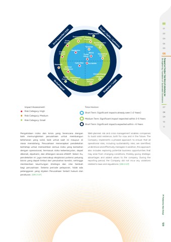 TechnologicalRegulator / Legal Environmental / ESGSocial / Politic / EconomicImpact Assessment:Risk Category: HighRisk Category: MediumRisk Category: SmallTime Horizon:Short Term: Significant impacts already seen (<2 Years)Medium Term: Significant impact expected within 2-5 YearsShort Term: Significant impacts expexted within >5 YearsPengelolaan risiko dan krisis yang terencana dengan baik memungkinkan perusahaan untuk membangun ketahanan yang solid, baik untuk saat ini maupun di masa mendatang. Perusahaan menerapkan pendekatan bertahap untuk memastikan semua risiko yang berkaitan dengan operasional, termasuk risiko keberlanjutan, dapat dikenali, dipahami, dan ditangani secara efektif. Selain itu, pendekatan ini juga mencakup eksplorasi potensi peluang bisnis yang dapat timbul dari perubahan kondisi, sehingga memberikan keuntungan strategis dan nilai tambah bagi perusahaan. Selama periode pelaporan, tidak ada pelanggaran yang dijalani Perusahaan terkait hukum dan peraturan. [GRI 2-27]Well-planned risk and crisis management enables companies to build solid resilience, both for now and in the future. The Company implements a phased approach to ensure that all operational risks, including sustainability risks, are identified, understood and effectively managed. In addition, this approach also includes exploring potential business opportunities that may arise from changing conditions, thereby giving strategic advantages and added values to the company. During the reporting period, the Company did not incur any violations related to laws and regulations. [GRI 2-27]AutonomousMachineArtificialIntelligenceClimate Change LitigationSocioeconomicInequalitiesEnvironmentalPollutionGeopoliticalConflictGreenEnergyTrumpEffectClimateChange BRICSMonetaryPoliciesDigitalCurrencyUU BUMNPandemicsCyber Risk NanotechMental HealthTerrorismSharingEconomic010203040506 Strengthening Foundation of Sustainable Governance Penguatan Fondasi Tata Kelola Keberlanjutan0708091011 PT Pertamina Hulu Energi 129