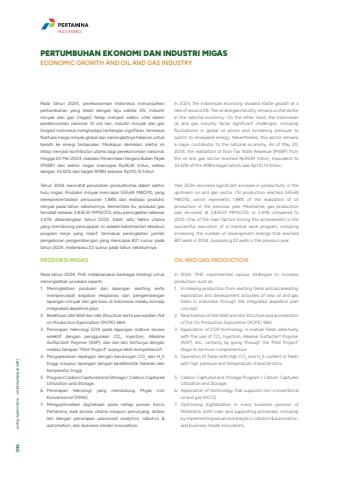 PERTUMBUHAN EKONOMI DAN INDUSTRI MIGASECONOMIC GROWTH AND OIL AND GAS INDUSTRYPada tahun 2024, perekonomian Indonesia menunjukkan pertumbuhan yang stabil dengan laju sekitar 5%. Industri minyak dan gas (migas) tetap menjadi sektor vital dalam perekonomian nasional. Di sisi lain, industri minyak dan gas (migas) Indonesia menghadapi tantangan signifikan, termasuk fluktuasi harga minyak global dan meningkatnya tekanan untuk beralih ke energi terbarukan. Meskipun demikian, sektor ini tetap menjadi kontributor utama bagi perekonomian nasional. Hingga 20 Mei 2024, realisasi Penerimaan Negara Bukan Pajak (PNBP) dari sektor migas mencapai Rp36,81 triliun, setara dengan 33,42% dari target APBN sebesar Rp110,15 triliun.Tahun 2024 mencatat perubahan produktivitas dalam sektor hulu migas. Produksi minyak mencapai 555,69 MBOPD, yang merepresentasikan penurunan 1,88% dari realisasi produksi minyak pada tahun sebelumnya. Sementara itu, produksi gas tercatat sebesar 2.832,61 MMSCFD, atau peningkatan sebesar 2,41% dibandingkan tahun 2023. Salah satu faktor utama yang mendorong pencapaian ini adalah keberhasilan eksekusi program kerja yang masif, termasuk peningkatan jumlah pengeboran pengembangan yang mencapai 821 sumur pada tahun 2024, melampaui 22 sumur pada tahun sebelumnya. PRODUKSI MIGASPada tahun 2024, PHE melaksanakan berbagai strategi untuk meningkatkan produksi seperti:1. Meningkatkan produksi dari lapangan existing serta mempercepat kegiatan eksplorasi dan pengembangan lapangan minyak dan gas baru di Indonesia melalui konsep integrated depletion plan. 2. Reaktivasi Idle Well dan Idle Structure serta percepatan Put on Production Exploration (POPE) Well.3. Penerapan teknologi EOR pada lapangan mature secara selektif dengan penggunaan CO2 Injection, Alkaline Surfactant Polymer (ASP), dan lain-lain tentunya dengan melalui tahapan %u201dPilot Project%u201d supaya lebih komprehensif. 4. Pengoperasian lapangan dengan kandungan CO2 dan H2S tinggi maupun lapangan dengan karakteristik tekanan dan temperatur tinggi.5. Program Carbon Captured and Storage / Carbon Captured Utilization and Storage.6. Penerapan teknologi yang mendukung Migas non Konvensional (MNK).7. Mengoptimalkan digitalisasi pada setiap proses bisnis Pertamina, baik proses utama maupun penunjang, antara lain dengan penerapan advanced analytics, robotics & automation, dan business model innovations. In 2024, the Indonesian economy showed stable growth at a rate of around 5%. The oil and gas industry remains a vital sector in the national economy. On the other hand, the Indonesian oil and gas industry faces significant challenges, including fluctuations in global oil prices and increasing pressure to switch to renewable energy. Nevertheless, this sector remains a major contributor to the national economy. As of May 20, 2024, the realization of Non-Tax State Revenue (PNBP) from the oil and gas sector reached Rp36.81 trillion, equivalent to 33.42% of the APBN target which was Rp110.15 trillion.Year 2024 recorded significant increase in productivity in the upstream oil and gas sector. Oil production reached 555.69 MBOPD, which represents 1.88% of the realization of oil production in the previous year. Meanwhile, gas production was recorded at 2,832.61 MMSCFD, or 2.41% compared to 2023. One of the main factors driving this achievement is the successful execution of a massive work program, including increasing the number of development drillings that reached 821 wells in 2024, surpassing 22 wells in the previous year.OIL AND GAS PRODUCTIONIn 2024, PHE implemented various strategies to increase production such as:1. Increasing production from existing fields and accelerating exploration and development activities of new oil and gas fields in Indonesia through the integrated depletion plan concept.2. Reactivation of Idle Well and Idle Structure and acceleration of Put On Production Exploration (POPE) Well.3. Application of EOR technology in mature fields selectively with the use of CO2 Injection, Alkaline Surfactant Polymer (ASP), etc., certainly by going through the \stage to be more comprehensive.4. Operation of fields with high CO2 and H2S content or fields with high pressure and temperature characteristics.5. Carbon Captured and Storage Program / Carbon Captured Utilization and Storage.6. Application of technology that supports non-conventional oil and gas (NCO).7. Optimizing digitalization in every business process of Pertamina, both main and supporting processes, including by implementing advanced analytics, robotics & automation, and business model innovations.HULU ENERGILaporan Keberlanjutan %u2022 Sustainability Report 140